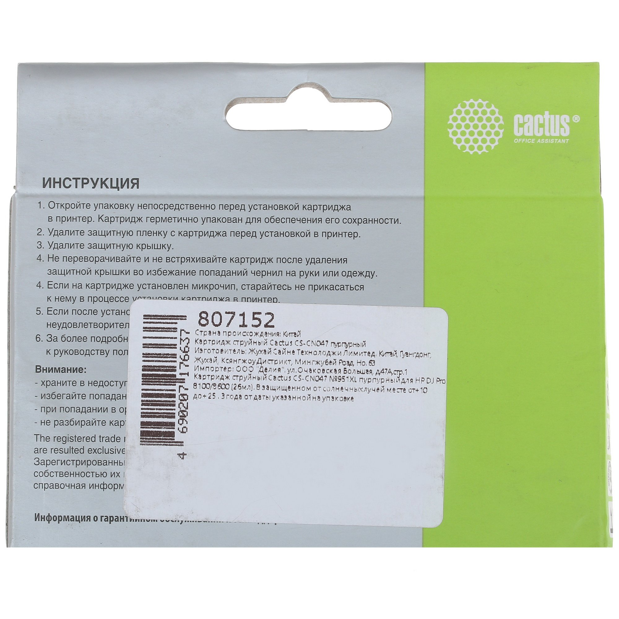 Cactus CS-CN047 помещен в герметичную упаковку, что способствует сохранности его свойств в процессе печати. Открывать упаковку рекомендуется непосредственно перед началом заправки. Ресурс картриджа рассчитан на печать 1500 страниц, на которых изображение будет четким, насыщенным и ярким. Емкость данного картриджа достигает 26 мл, что позволяет пользователям на время позабыть о том, что нужно менять устройство.