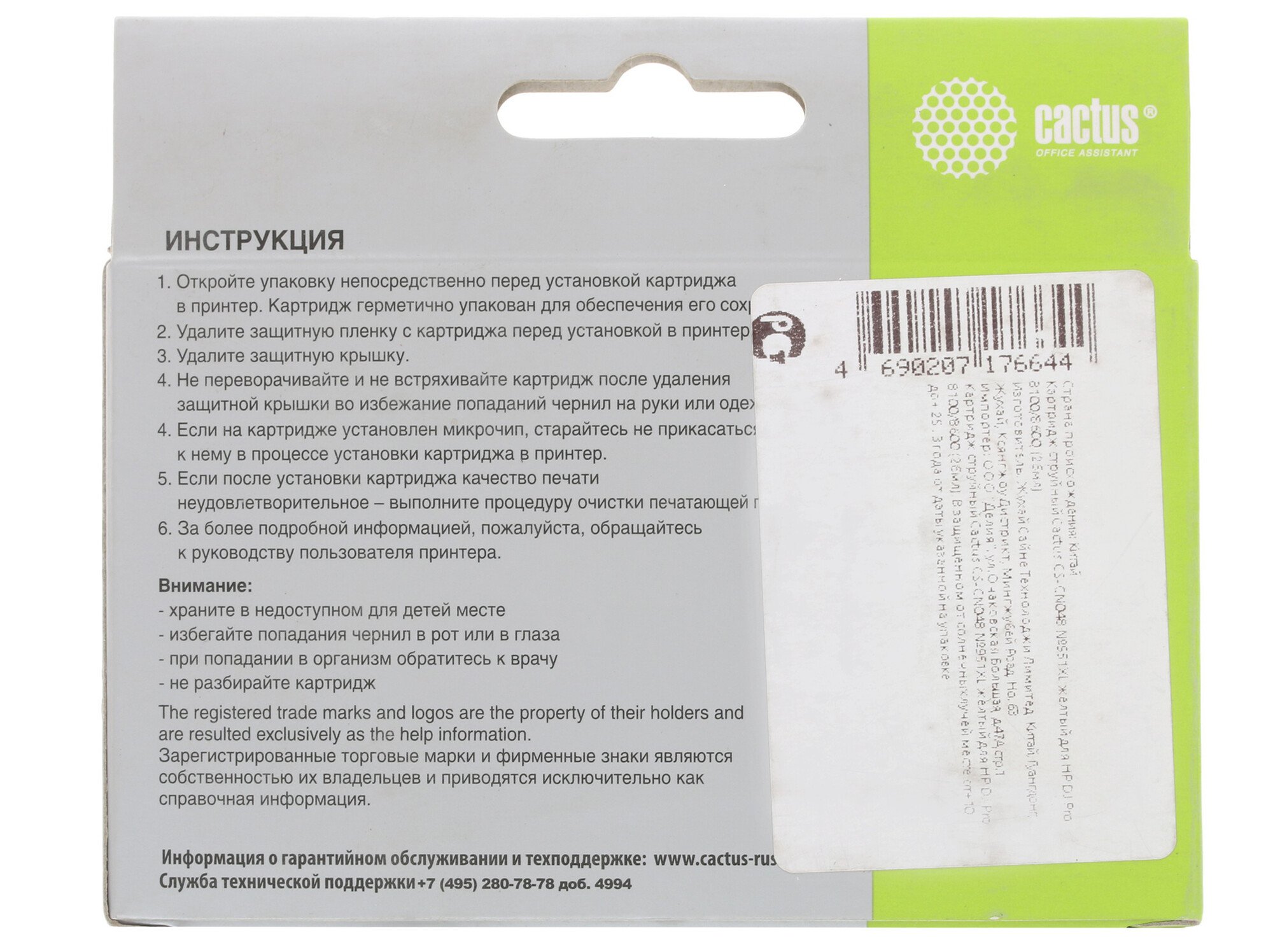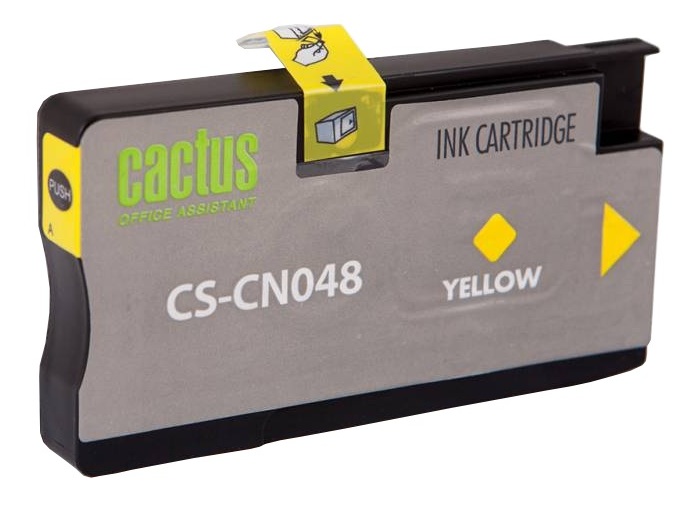 Картридж струйный Cactus CS-CN048 изготовлен для использования в принтерах HP. Более точные модели перечислены на лицевой стороне коробки, в которой продается картридж. Чернила желтого цвета, используемые в картридже, хранятся в 26-миллилитрвой емкости, заключенной внутри прочного пластикового корпуса. Такого объема чернил хватает на распечатку 1500 страниц текста. Поэтому такой картридж можно использовать для офисных нужд или домашнего использования.