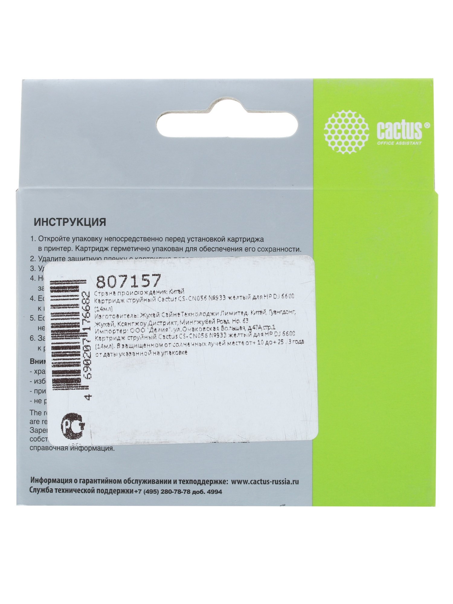 Картридж струйный Cactus CS-CN056 наполнен желтыми чернилами. Емкость изделия равна 14 мл. Картридж прост в установке: производителем расходного материала обеспечена необходимая степень совместимости. Модель упакована в компактную коробку, преимущественно окрашенную в светло-зеленый цвет.