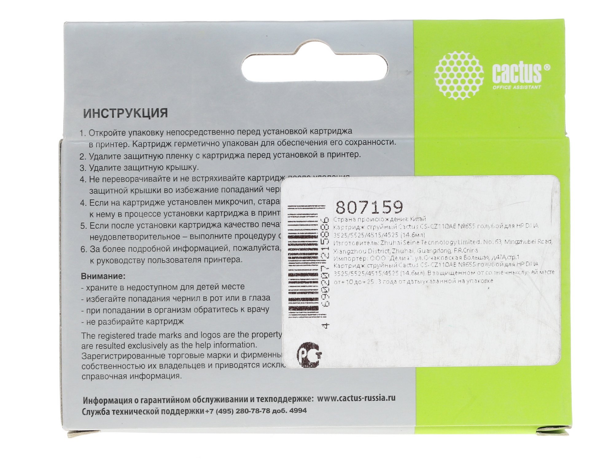 Картридж струйный Cactus CS-CZ110AE №655 голубой (14,6 мл) для HP DJ IA 3525/5525/4515/4525