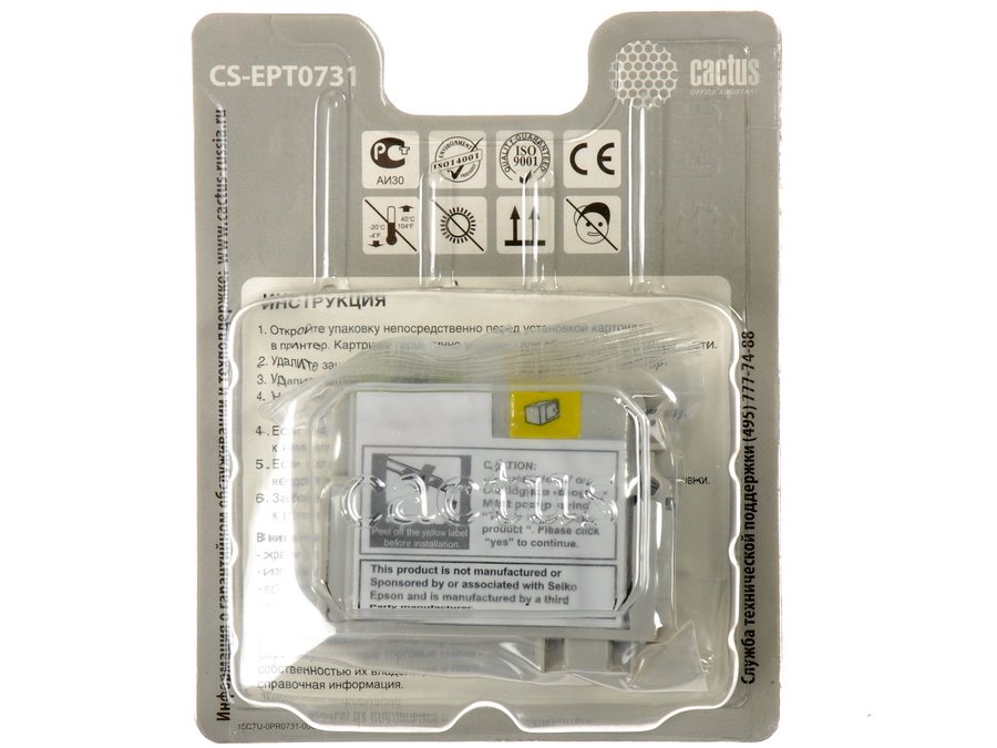 Конструкция Cactus CS-EPT0731 предотвращает преждевременное проявление дефектов в виде утечки чернил, повреждения печатающей головки и пятен на бумаге. Картридж заправлен водорастворимыми черными чернилами объемом 11 мл. Его ресурс составляет 485 страниц при 5% заполненности. В целом расход и качество печати зависит от эксплуатируемой модели печатного устройства и степени заполненности страницы.