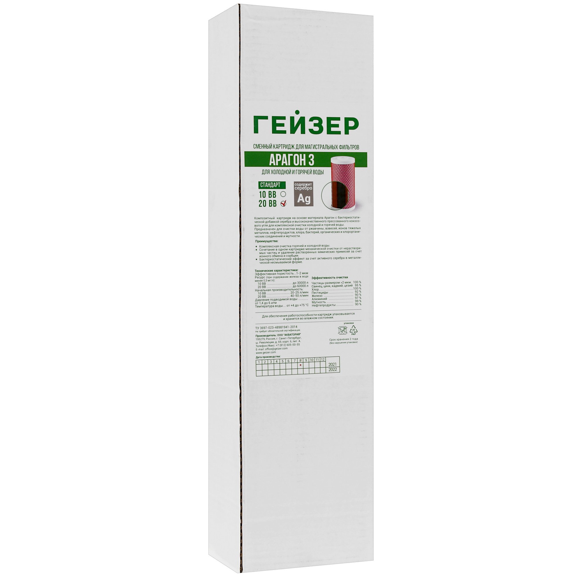 Картридж для фильтра Гейзер Арагон-3 20ВВ обеспечивает комплексную очистку воды от различных примесей и вредных веществ. Он основан на использовании предварительного фильтра, материала Арагон и карбонового блока. Процесс очистки выполняется в три стадии – механическая, ионообменная и сорбционная. Фильтр устраняет железо, механические примеси, хлор, тяжелые металлы, а также защищает от бактерий и смягчает воду. Ресурс фильтрующего элемента составляет в пределах 60000 часов. Картридж Гейзер Арагон-3 20ВВ выполнен в универсальном типоразмере 20ВВ.