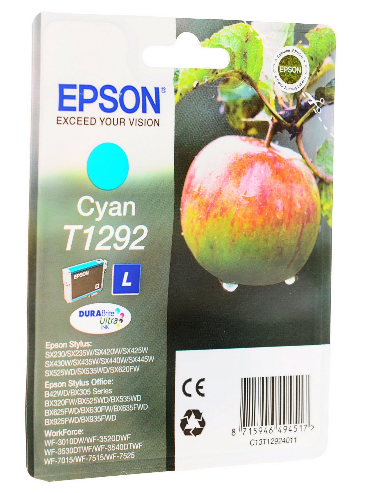 Картридж заправлен 7 мл пигментных чернил Epson DURABRrite. Используя Epson T1292 (L) Вы можете получить отпечатки текста, графики или изображений как на специальной бумаге для принтеров, так и на глянцевой или матовой фотобумаге. Отпечатки можно хранить несколько лет, они стойкие к смазыванию и влаге, не утратят своего качества и не выцветут.