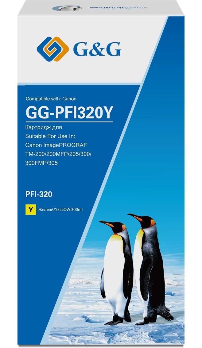 Желтый картридж G&G GG-PFI320Y PFI-320Y – совместимый расходный материал для струйных принтеров Canon. Емкость изделия составляет 300 мл. Расходный материал подходит для 4 моделей принтеров – Canon imagePROGRAF TM-200, Canon imagePROGRAF TM-205, Canon imagePROGRAF TM-300 и Canon imagePROGRAF TM-305. Картридж G&G GG-PFI320Y PFI-320Y используется в качестве замены оригинального картриджа Canon PFI-320 Y.