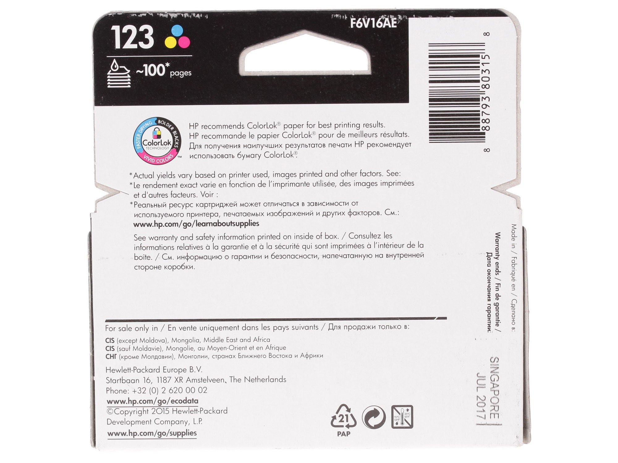 Струйный картридж HP 123 (F6V16AE) – контейнер с чернилами, предназначенный для принтера HP DeskJet 2130. Изделие можно хранить при температуре от +60 до –40 °C. Картридж исправно функционирует от +15 до +32 °C.