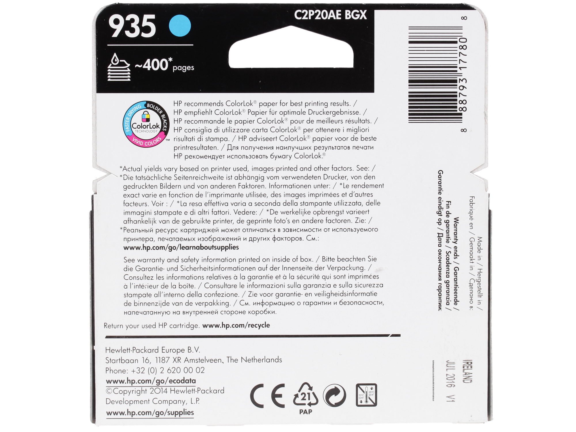 Вместительная емкость изделия HP 935 (C2P20AE) составляет 4.5 мл, чего достаточно для заполнения текстом порядка 400 страниц формата А4. Влагоустойчивая краска, которая содержится в данном струйном картридже, быстро сохнет и имеет насыщенный яркий цвет.
