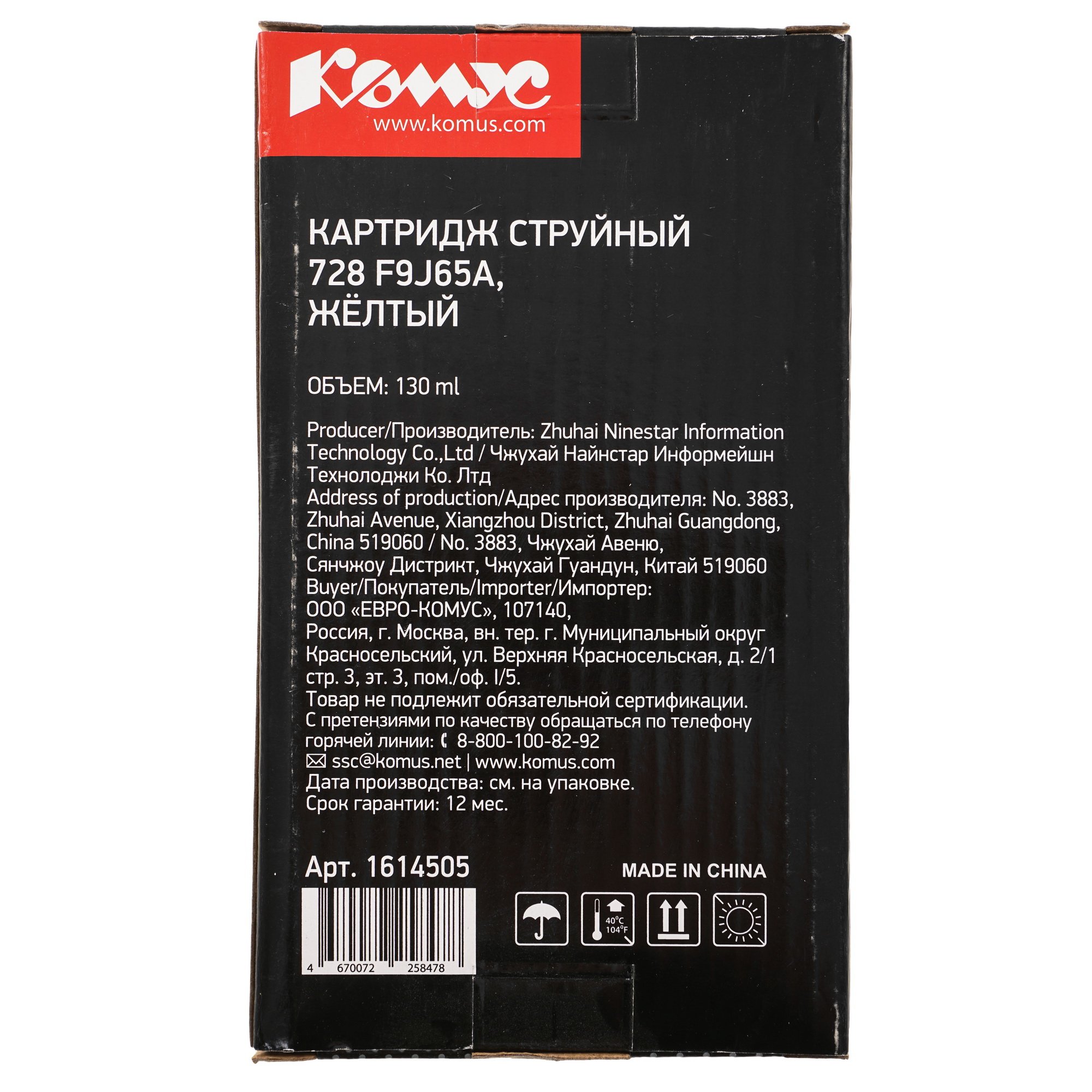 Картридж Комус 728 F9J65A – расходный элемент с чернилами желтого цвета, который можно установить в ряд струйных принтеров и МФУ фирмы HP. По составу модель ни в чем не уступает оригинальному расходнику и обеспечивает такое же качество печати. Чернила моментально впитываются в поверхность листа, не смазываются и не выгорают от солнечных лучей. Благодаря чипу картридж Комус 728 F9J65A сможет передавать печатному устройству информацию о количестве отпечатанных листов. Одна емкость содержит в себе 130 мл чернил для печати.