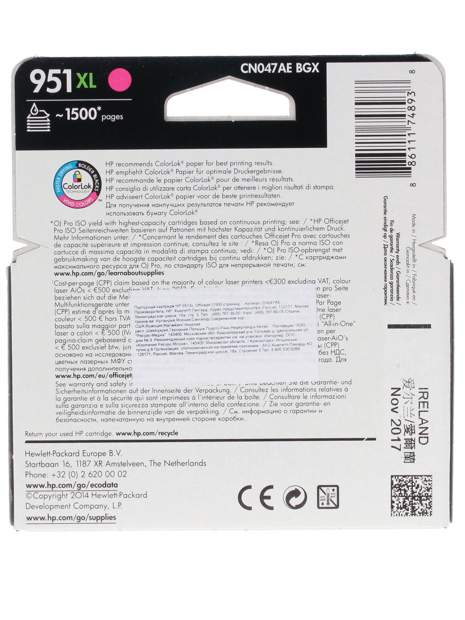 HP 951XL (CN047AE) прост в эксплуатации и обладает повышенным ресурсом: 1500 страниц при 5% заполненности. Поэтому расход чернил будет зависеть от степени заполненности самой страницы. 5% заполненность – это стандартный текст без изображений. Конструкция картриджа такова, что исключается возможность проявления таких дефектов во время печати, как пятна или утечка чернила. Повреждение печатающей головки тоже сводится к минимуму.