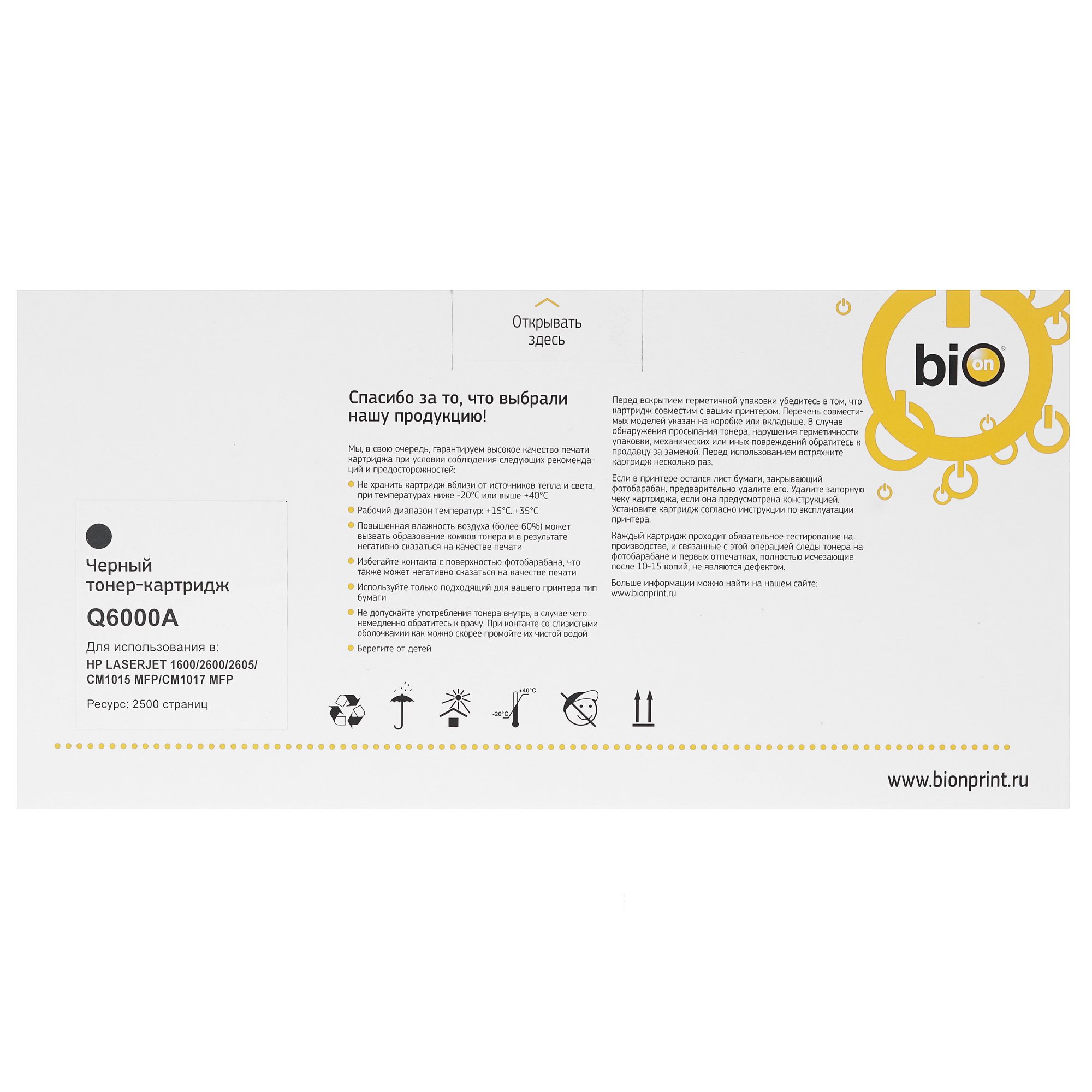 В лазерном картридже BION Q6000A используется черный тонер: этот цвет является самым востребованным среди многочисленных пользователей офисной техники и используется для печати различных документов. Отпечатки, сделанные с использованием этого расходного материала, порадуют вас четкими контурами букв, цифр и других объектов, а также отменной устойчивостью к воздействию ультрафиолета. Одного такого картриджа хватит на печать около 2500 страниц, что делает его оптимальным вариантом для нечастой домашней печати.