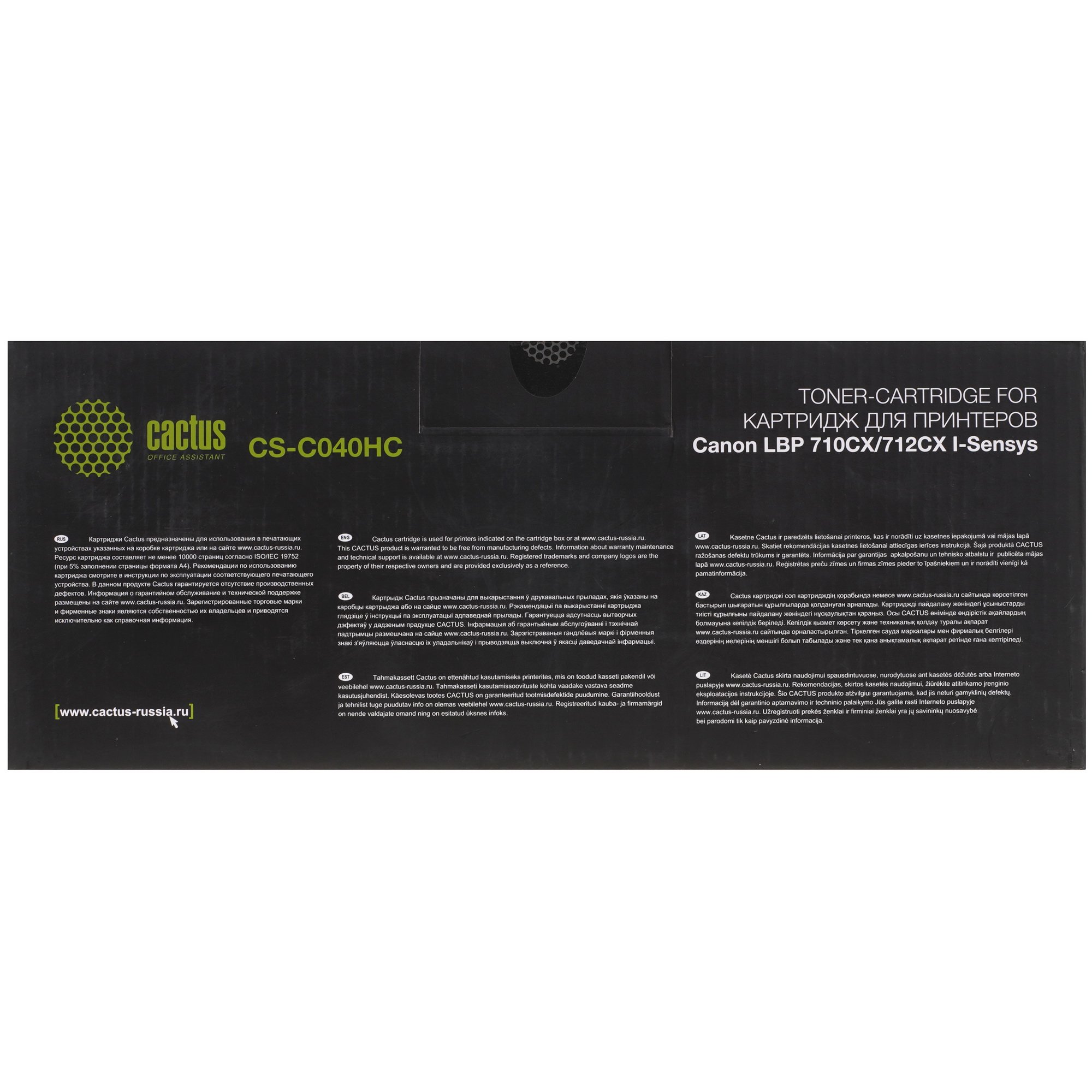 Совместимый расходник Cactus CS-C040HC предназначен для установки в печатающие устройства Canon i-SENSYS LBP 710Cx и 712Cx. Перед использованием с картриджа нужно снять защищающую от высыпания чернил ленту. Правильно установленное устройство должно свободно скользить по направляющим.