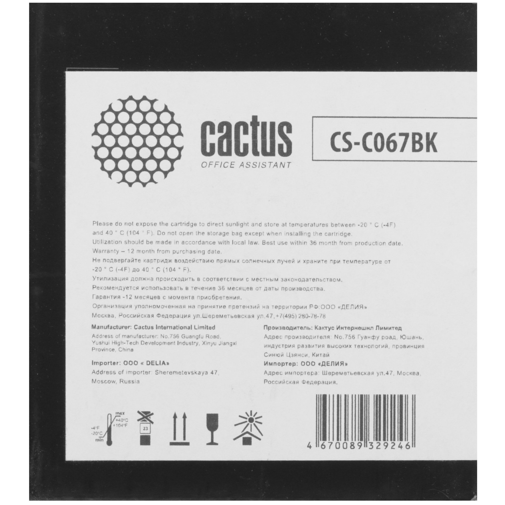 Cactus CS-C067BK ‒ сменный блок для лазерного принтера, заправленный черным тонером. Две его части скреплены штифтами. В одной из них находится магнитный вал, контейнер с тонером и дозирующее лезвие. Вторая часть включает в себя емкость для отработанного порошка, фотобарабан и другие элементы для переноса красителя на бумагу. Картридж оснащен микрочипом, который хранит информацию о нем. При исчерпании ресурса чип блокирует печать.