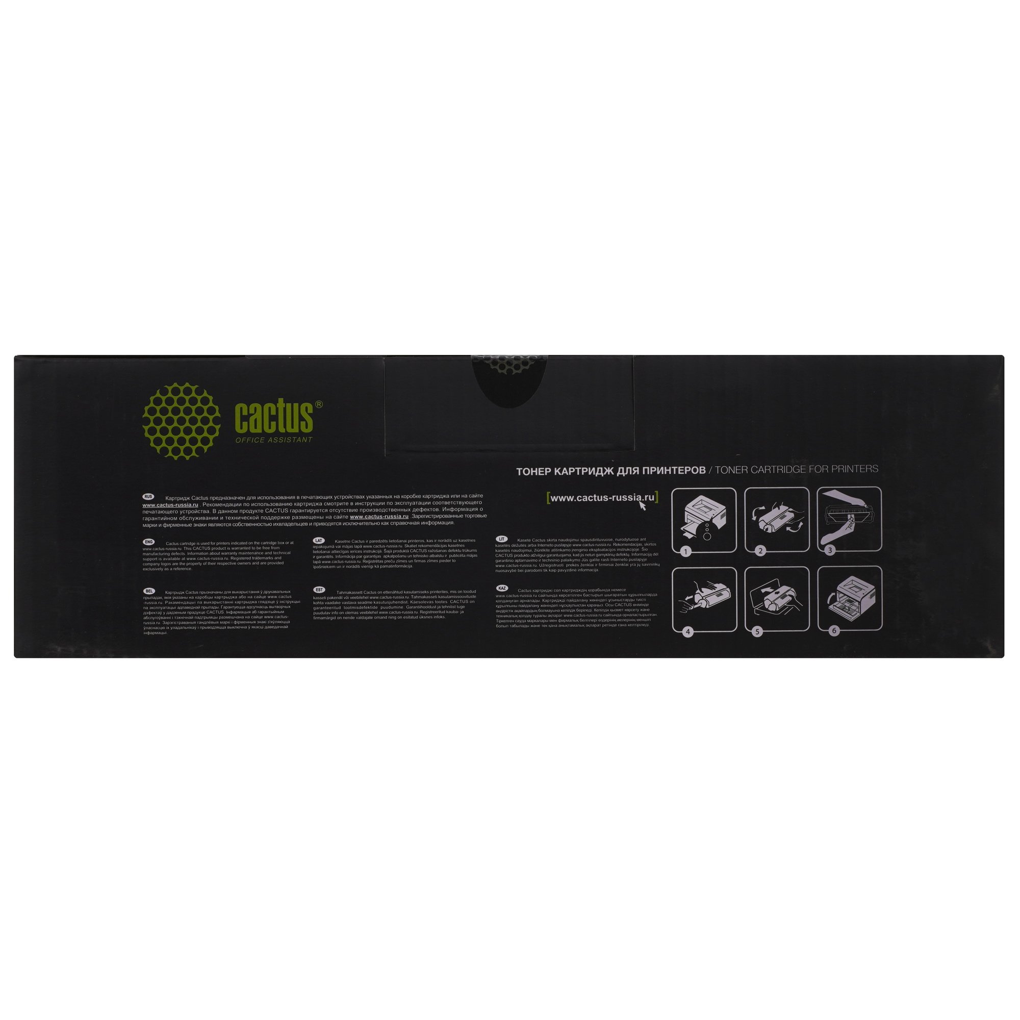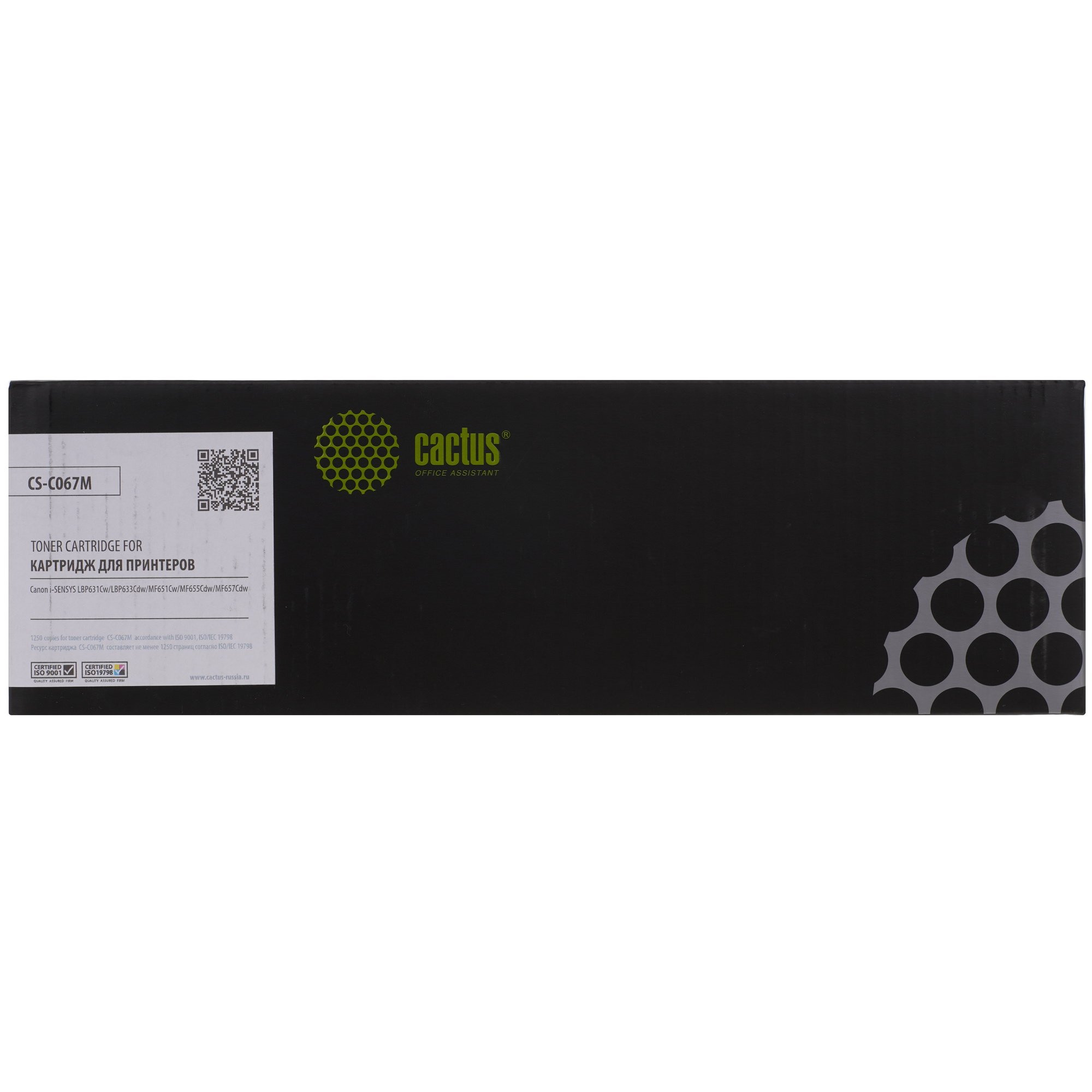 Cactus CS-C067M ‒ сменный блок для лазерного принтера, заправленный пурпурным тонером. Две его части скреплены штифтами. В одной из них находится магнитный вал, контейнер с тонером и дозирующее лезвие. Вторая часть включает в себя емкость для отработанного порошка, фотобарабан и другие элементы для переноса красителя на бумагу. Картридж оснащен микрочипом, который хранит информацию о нем. При исчерпании ресурса чип блокирует печать.
