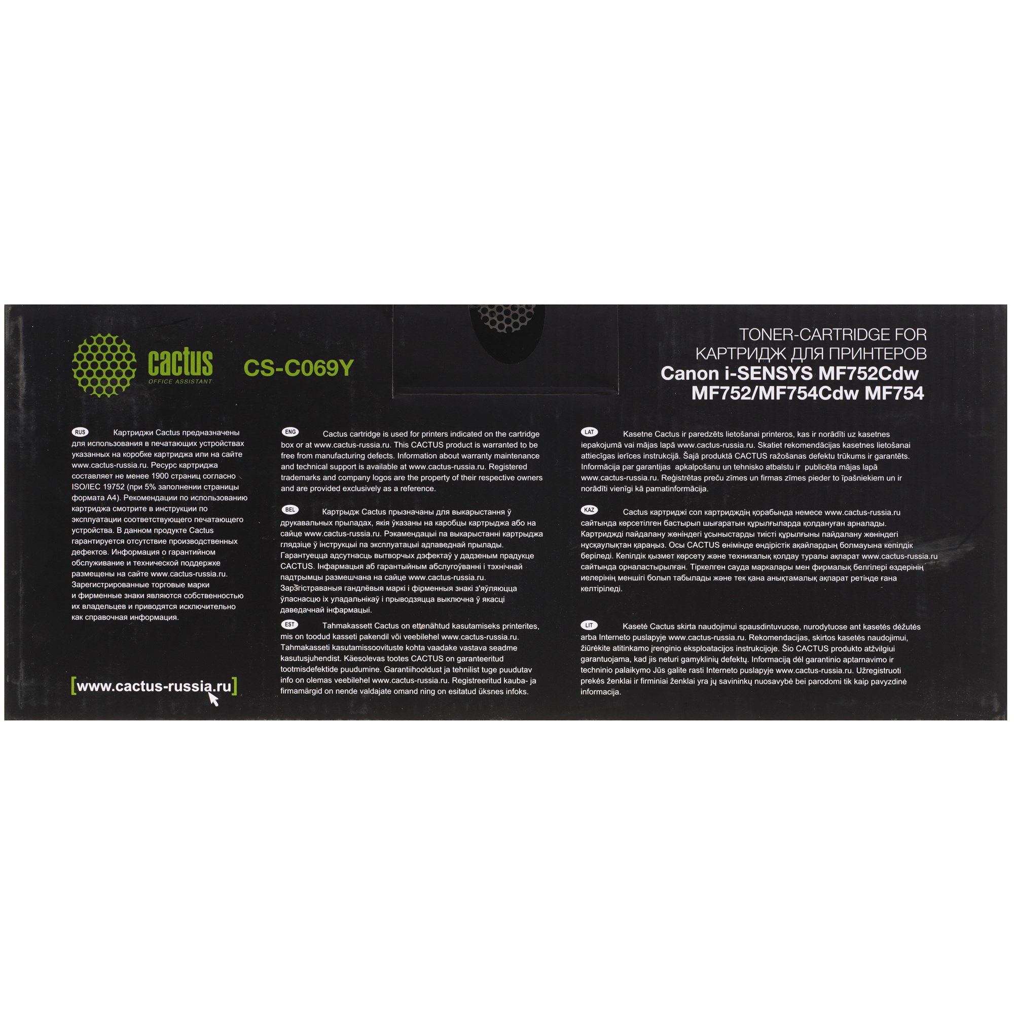 Ресурса Cactus CS-C069Y хватает на печать 1900 страниц. Особенность модели ‒ в оснащении чипом. Это микросхема с информацией о картридже, которая блокирует работу принтера, когда ресурс исчерпан.