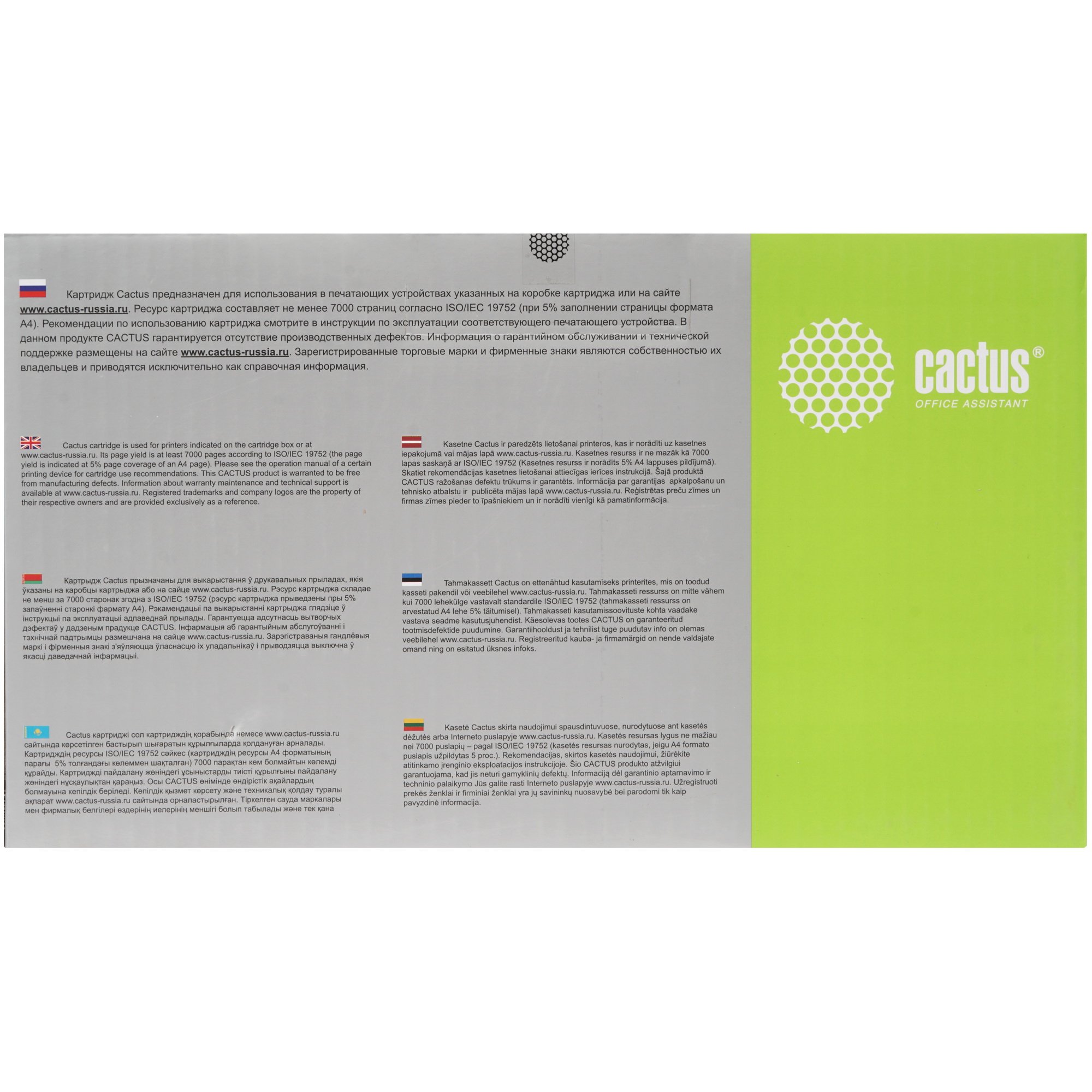 Картридж лазерный Cactus CS-C715H характеризуется ресурсом, составляющим 7000 страниц. Упаковка расходного материала – коробка. На упаковке есть данные как о совместимом с картриджем оборудовании, так и информация о ресурсе.