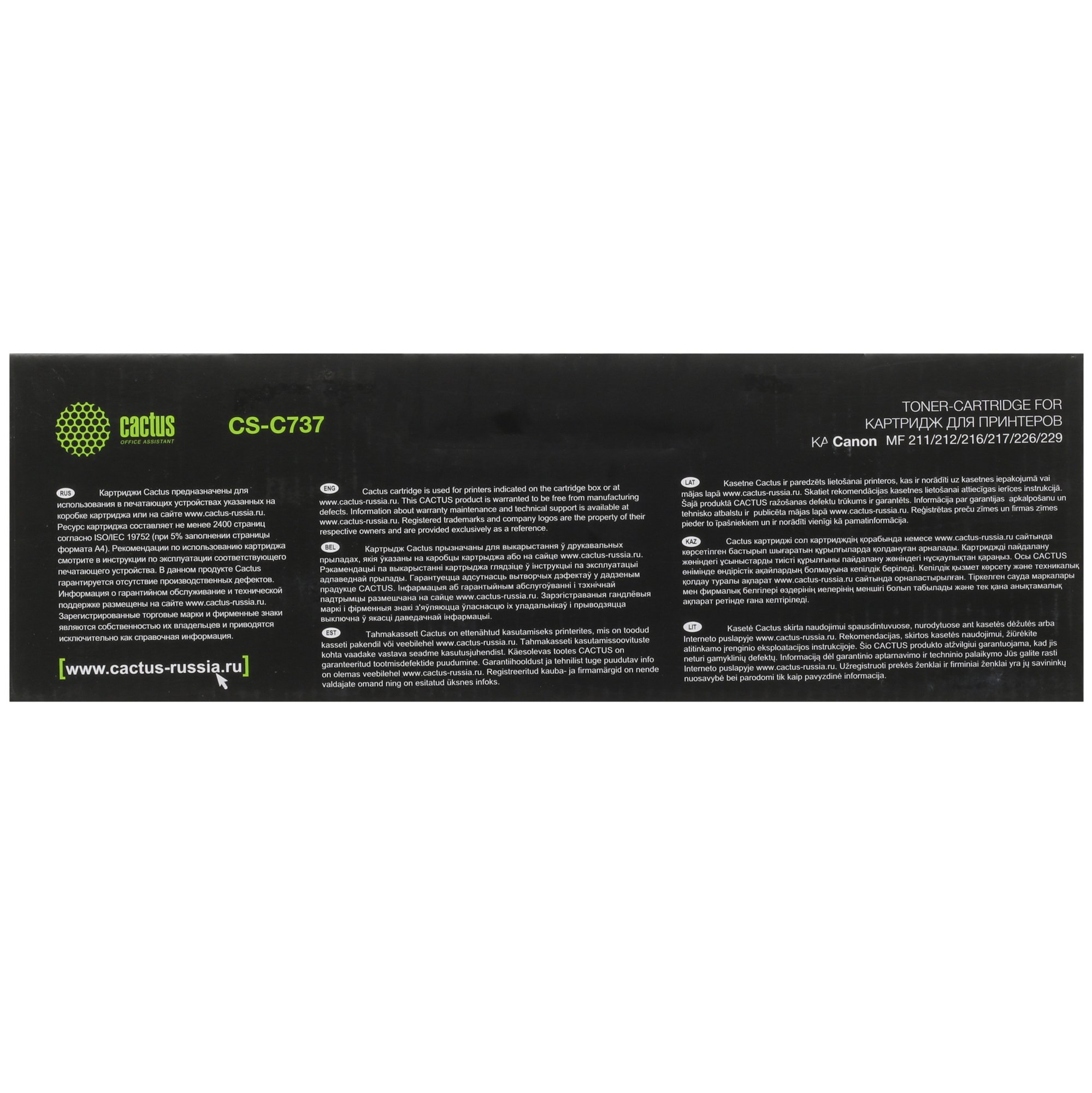 Cactus CS-C737 изготавливается с помощью высокотехничных материалов, нацеленных на продление срока службы устройства. Картридж подходит для многократной эксплуатации и печати до 2400 страниц за одну заправку. Cactus CS-C737 способен обеспечить для вас печать высокого качества.