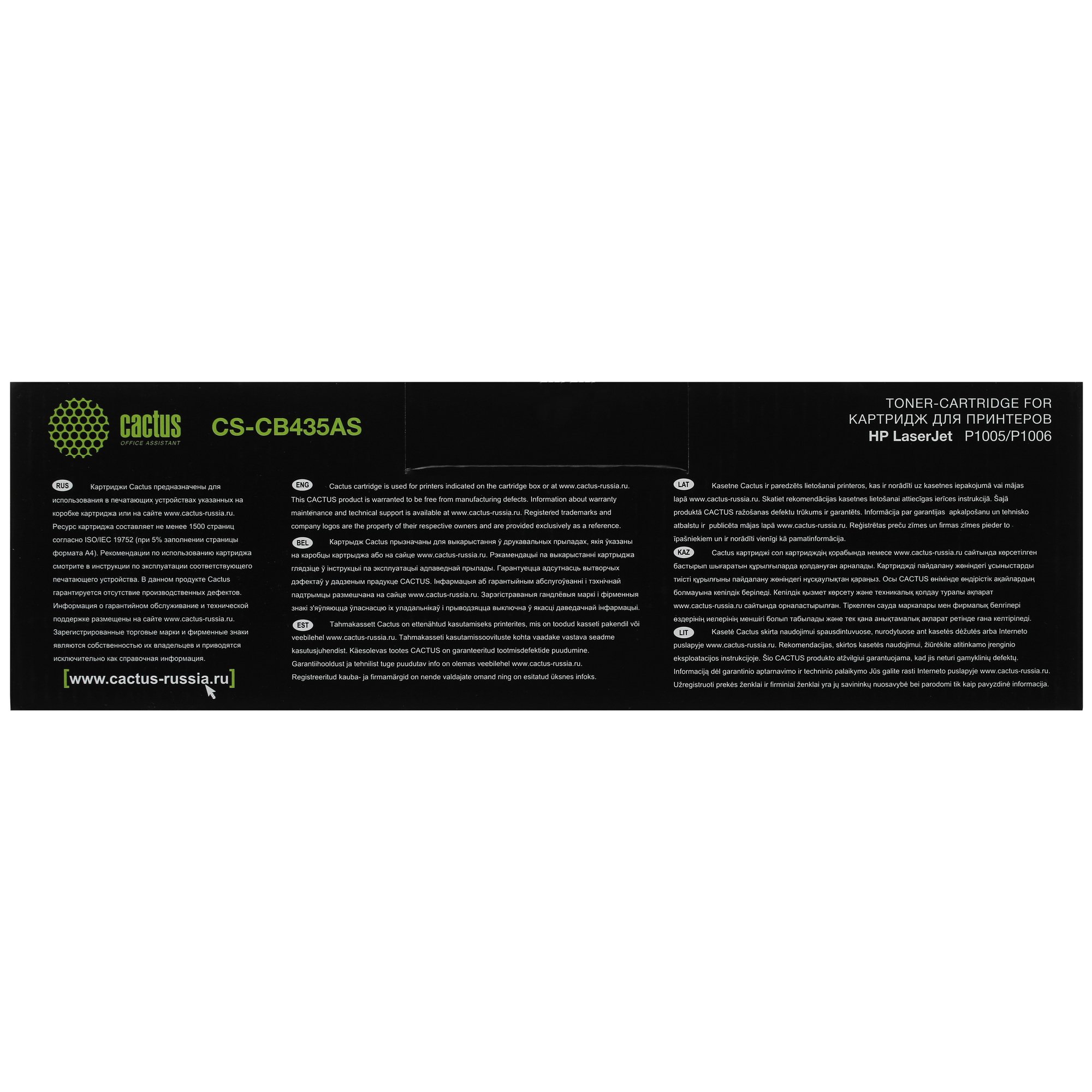 Cactus CS-CB435A разработан по последним технологиям и изготовлен из качественных японских материалов. Картридж сделан по стандартам STMC и ISO, подходит для многократной эксплуатации и печати до 1500 страниц за одну заправку. Устройство легко установить и для использования при дальнейшей работе. Cactus CS-CB435A – это приспособление для черно-белой печати.