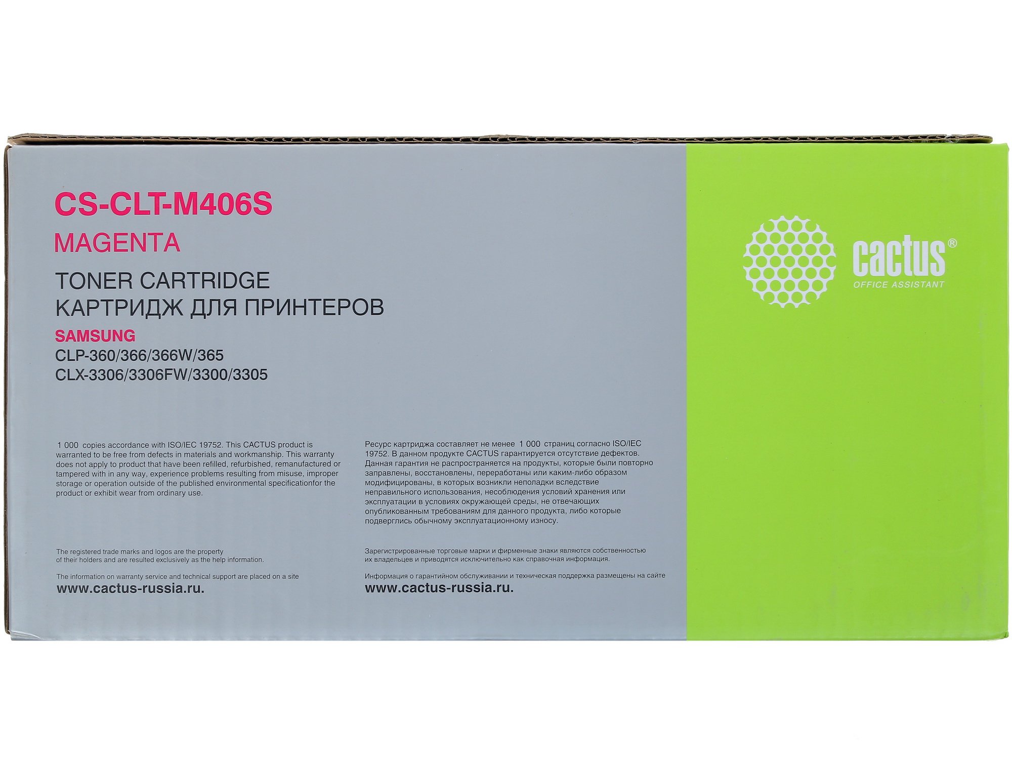 Являясь совместимым расходным материалом, картридж лазерный Cactus CS-CLT-M406S по своим характеристикам, экономичности, удобству использования и установки, ничуть не уступает оригинальным картриджам для таких принтеров как Samsung CLP-360, Samsung CLP-365, Samsung CLX-3300, Samsung CLX-3305 и т.д. С таким расходным материалом вам обеспечены бесперебойный процесс печати, долгий срок службы картриджа, четкие и яркие отпечатки вплоть до полного окончания ресурса, который в Cactus CS-CLT-M406S пурпурного цвета составляет 1000 страниц.