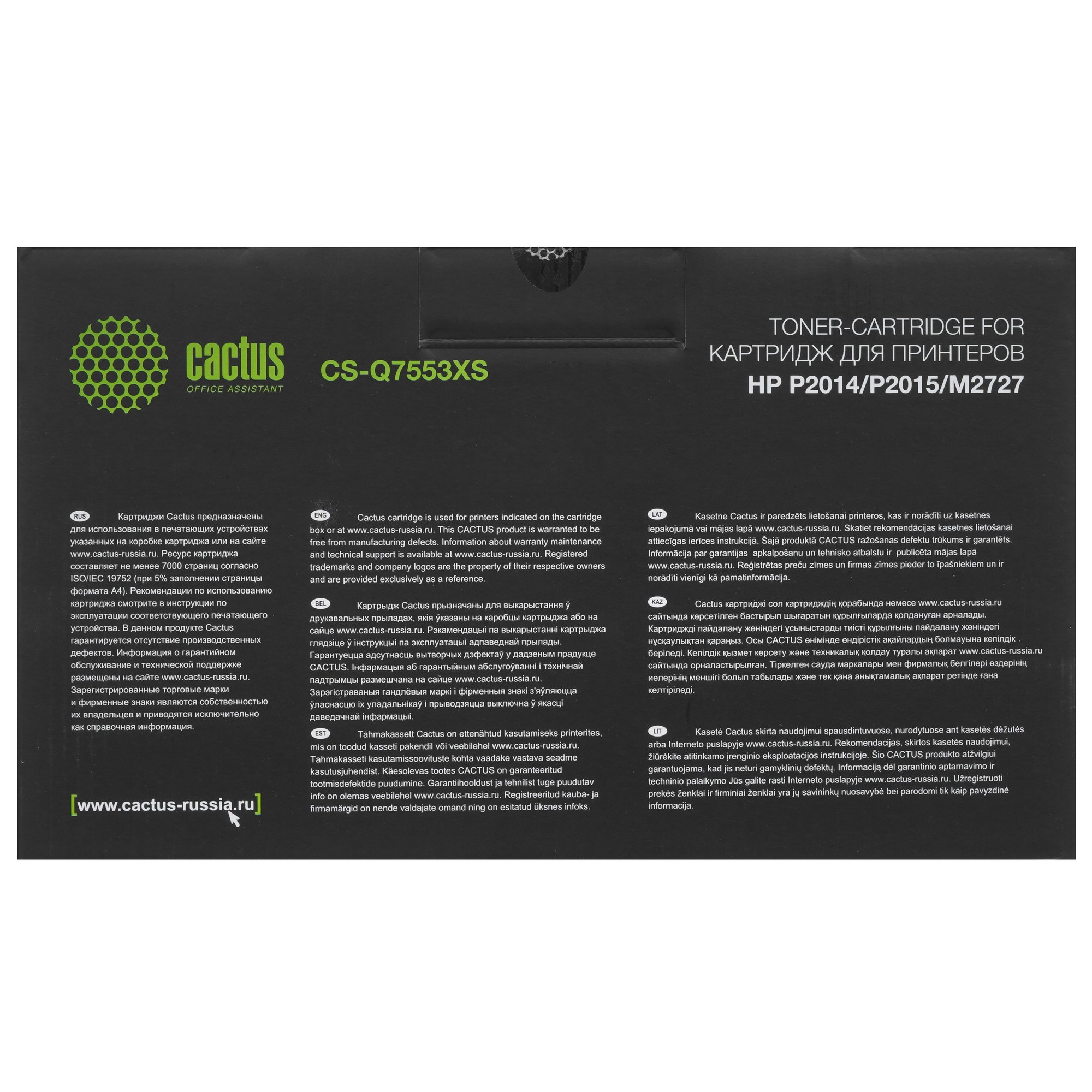 Картридж Cactus CS-Q7553XS имеет ресурс, который оценивается производителем в 7000 страниц. Установка и дальнейшая эксплуатация изделия не вызовут у вас сложностей. Обеспечению нужных условий хранения поспособствует прочная и компактная коробка, в которую упакован картридж. На упаковке размещена краткая информация о совместимых с картриджем устройствах.