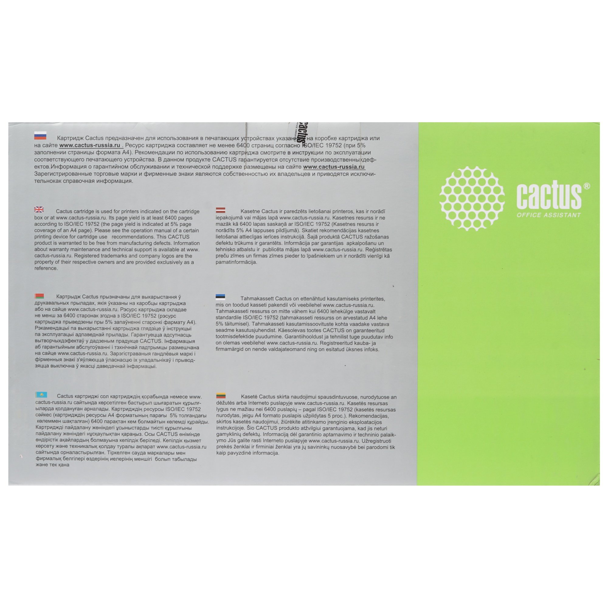 Картридж Cactus CS-SP377 предназначен для черной печати. Ресурс расходного материала, заявленный производителем, составляет 6400 страниц. Картридж упакован в прочную картонную коробку, дизайн которой соответствует стилистике Cactus. На упаковке размещена сопутствующая информация, в том числе – данные о ресурсе.
