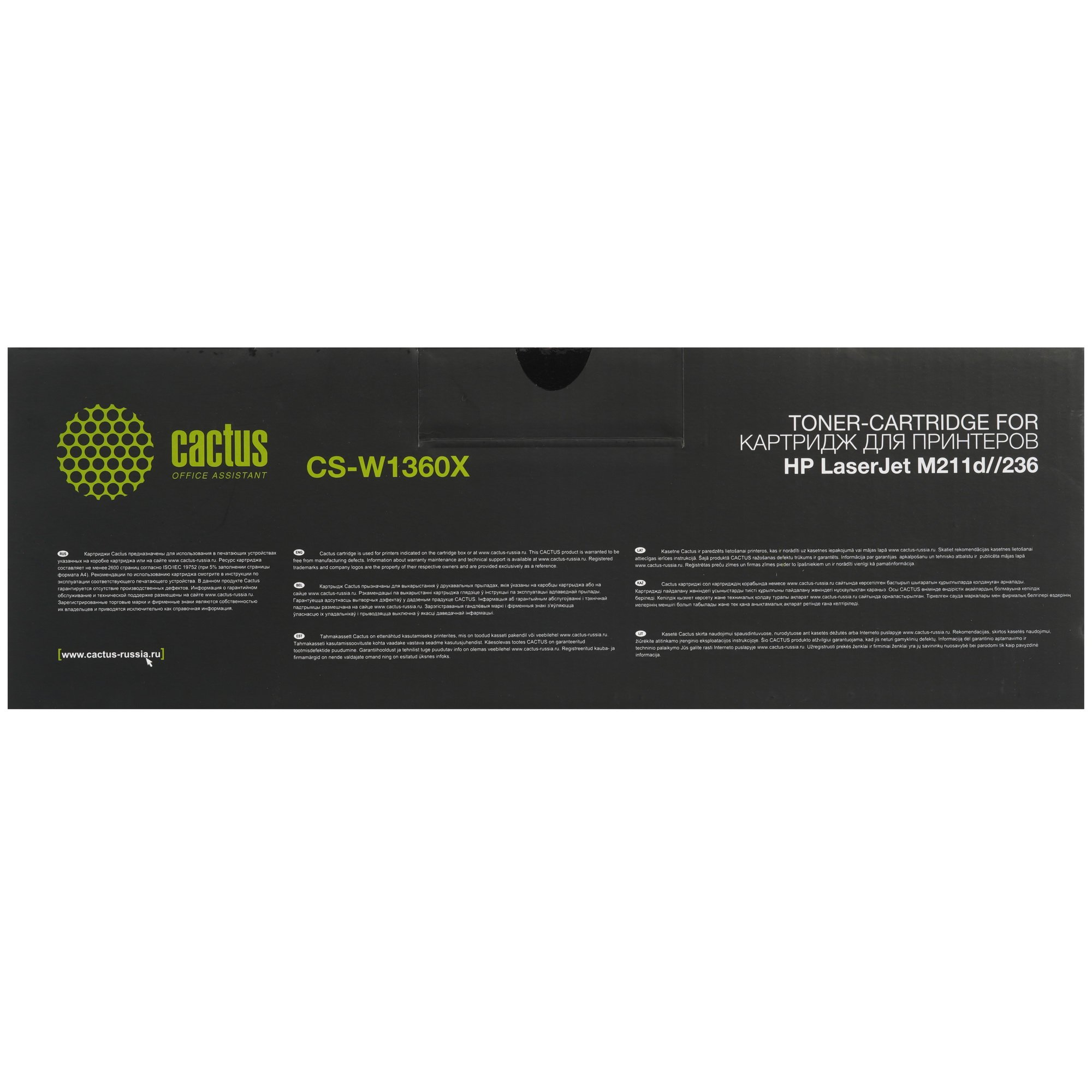 Cactus CS-W1360X использует тонер черного цвета. Это порошок с магнитными частицами, который притягивается к фотобарабану в виде будущей картинки и нагревается на его поверхности. После этого краситель отпечатывается на бумаге. Картридж устанавливается в принтер вместе с компонентами других цветов ‒ пурпурного, голубого и желтого. Частицы красителей смешиваются, создавая разные оттенки.