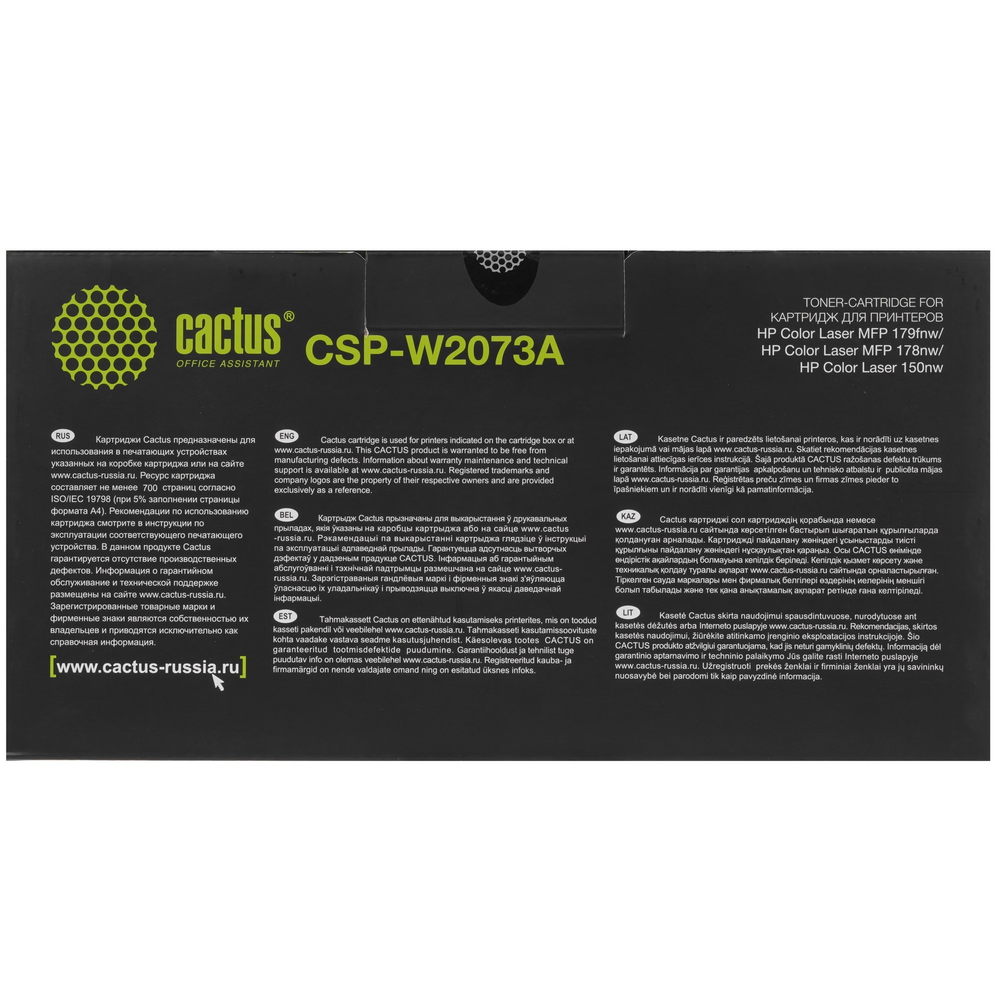Тонер Cactus CSP-W2072A имеет вид порошка с мелкодисперсными частицами. Благодаря магнитному составу крупинки притягиваются к поверхности фотобарабана, формируя на нем будущее изображение. Стойкость и четкость отпечатков обеспечивает быстрое высыхание красителя после печати. Компонент рассчитан на печать 700 страниц. Встроенная микросхема блокирует печать при исчерпании ресурса картриджа.