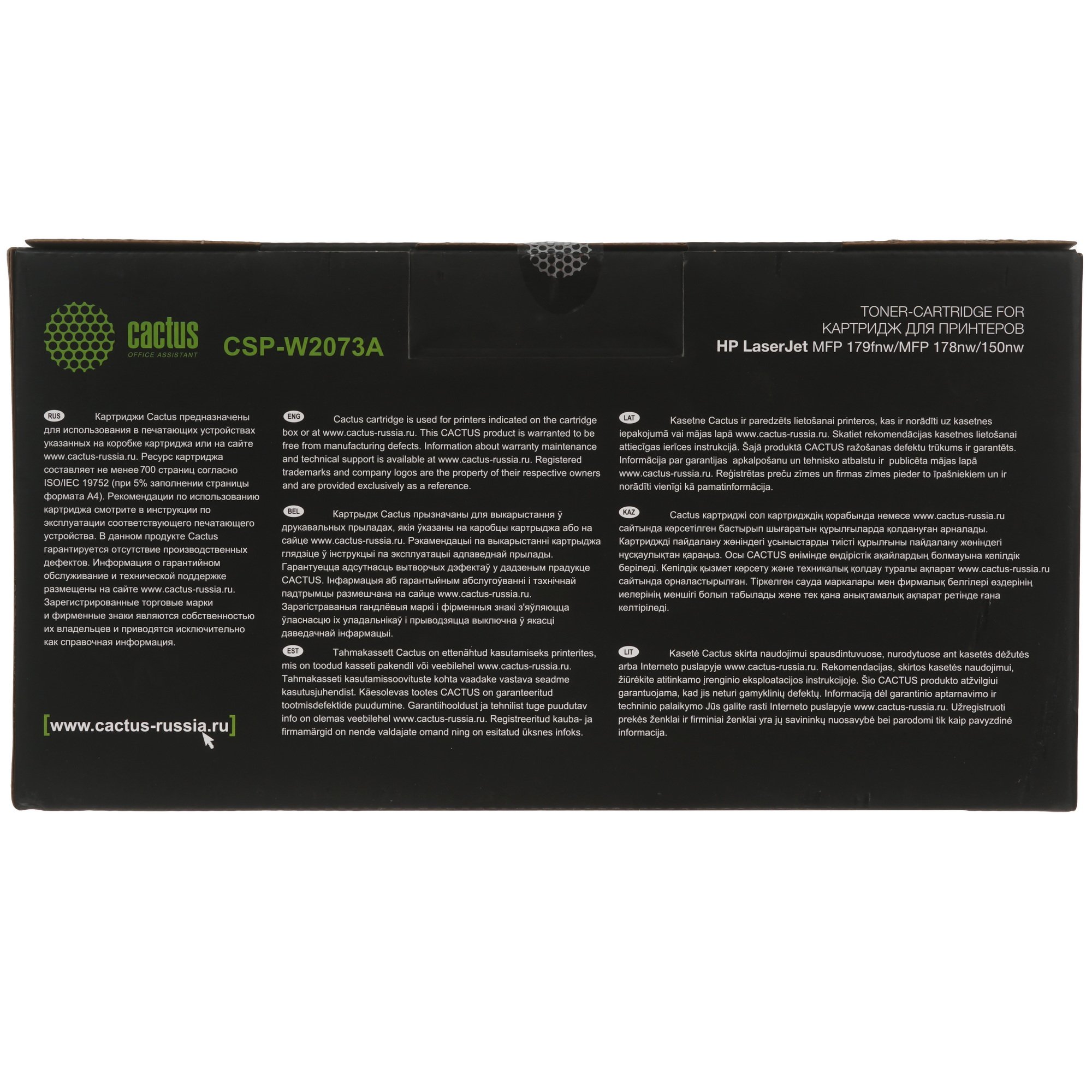 Тонер Cactus CSP-W2073A имеет вид порошка с мелкодисперсными частицами. Благодаря магнитному составу крупинки притягиваются к поверхности фотобарабана, формируя на нем будущее изображение. Стойкость и четкость отпечатков обеспечивает быстрое высыхание красителя после печати. Компонент рассчитан на печать 700 страниц. Встроенная микросхема блокирует печать при исчерпании ресурса картриджа.