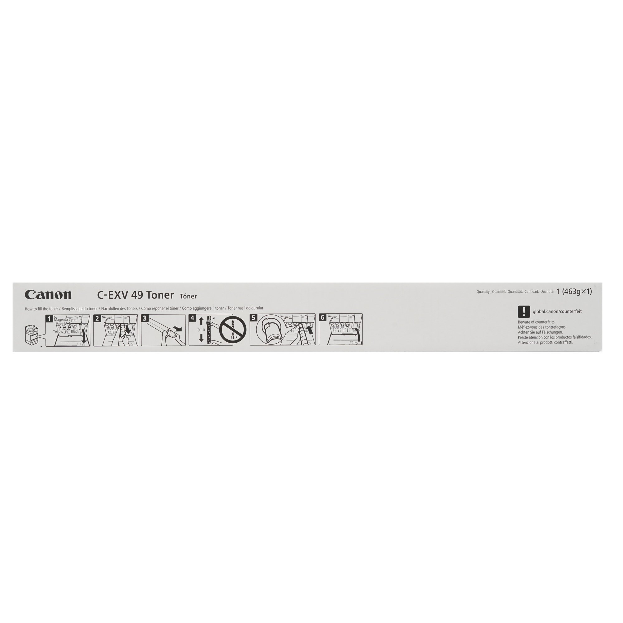 Картридж лазерный Canon C-EXV49Y наполнен тонером желтого цвета. Ресурс расходного материала – 19000 страниц. Полная сопутствующая информация о картридже размещена на упаковке, в качестве которой производителем была использована картонная коробка.