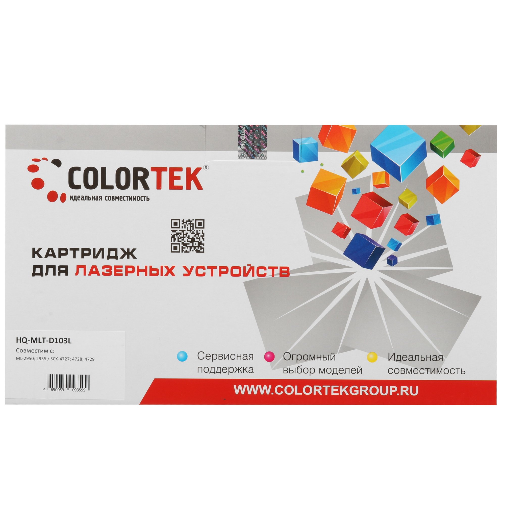 Картридж лазерный Colortek MLT-D103L подходит для обслуживания семи моделей МФУ и принтеров Samsung. Повышенная емкость заправлена черным порошковым тонером. Рабочий ресурс совместимой модели достигает 2500 страниц при заполнении чернилами 5% места на стандартных листах A4.