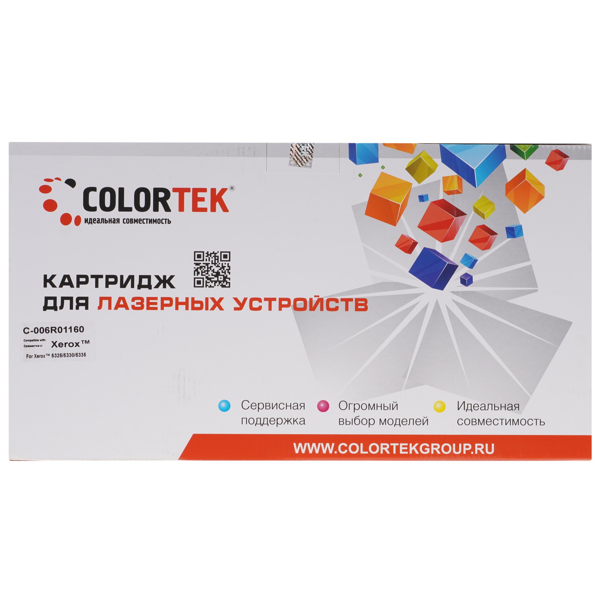 Colortek 006R01160 5325/5330/5335 – совместимый расходник с тремя моделями МФУ Xerox. На картридже есть чека в виде яркой ленты для защиты от просыпания краски при хранении и перевозке. При установке важно следить за легким скольжением расходника по направляющим. Сильное давление может привести к поломке пластиковых деталей, а некорректная установка – к дефектам печати и выходу принтера из строя.