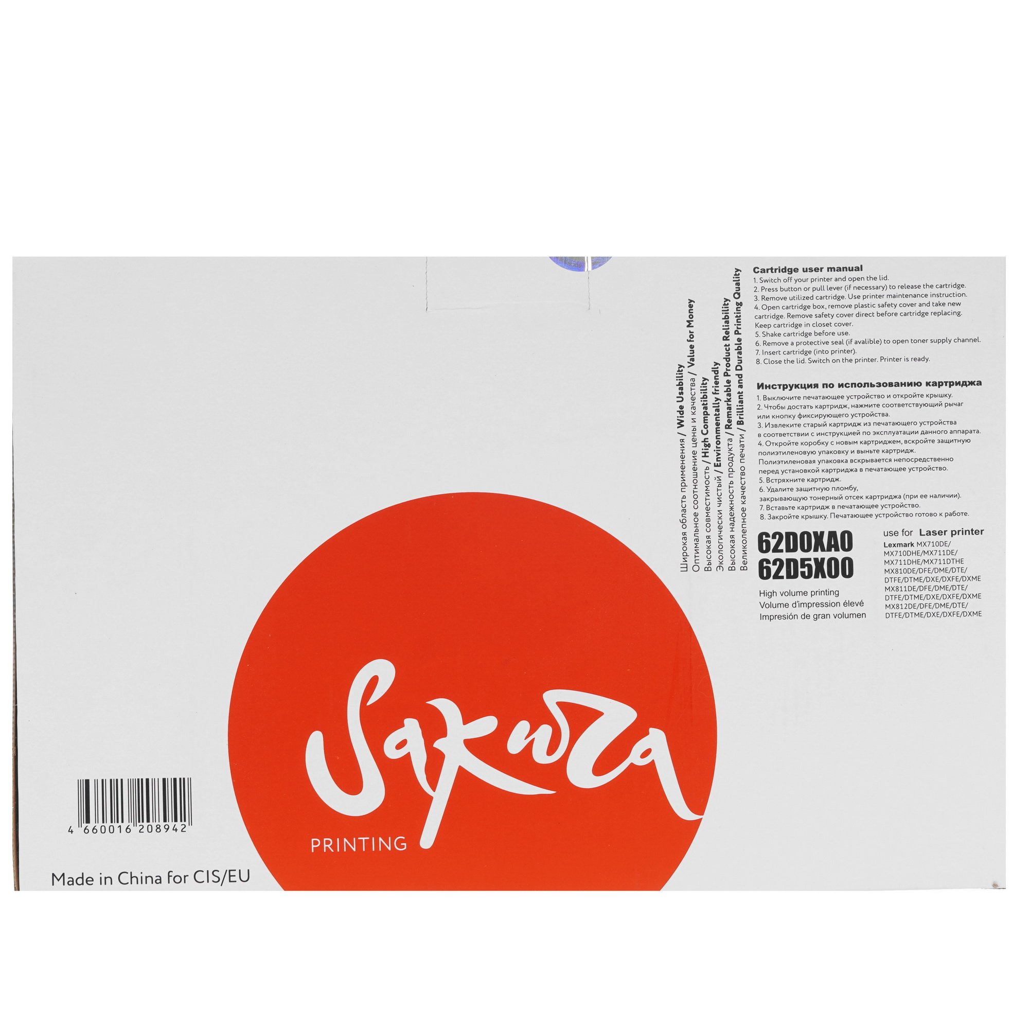 Картридж SAKURA 62D0XA0/62D5X00 совместим с лазерными принтерами Lexmark. Он использует черный тонер в качестве красящего вещества. Порошок помещен в одну из емкостей, установленных внутри картриджа. Для отработанного красителя используется другая емкость. Благодаря магнитному составу частиц тонер легко притягивается к поверхности фотобарабана. Там он расплавляется и при помощи резинового вала отпечатывается на бумаге в виде стойкого изображение.