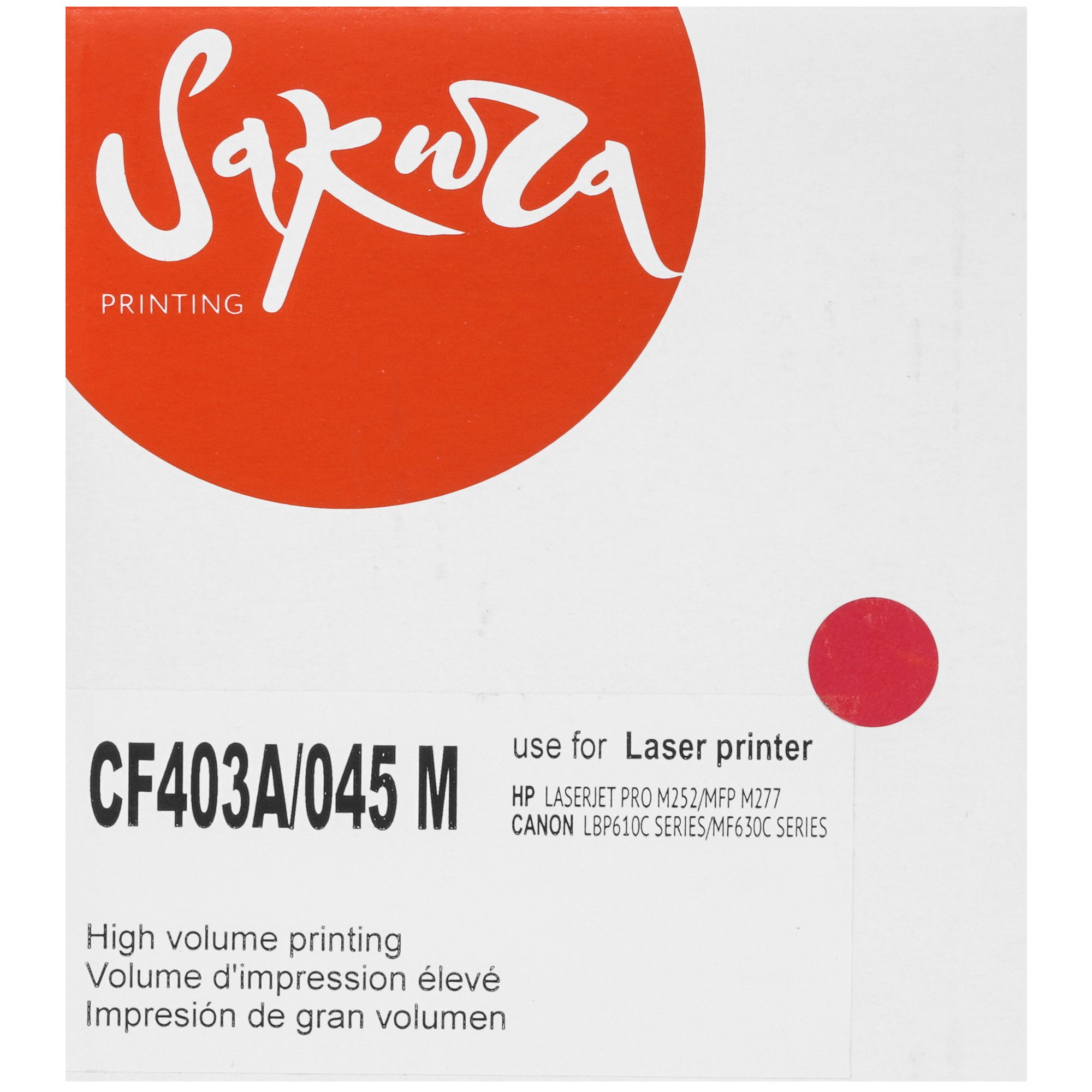 Картридж лазерный SAKURA CF403A/045M с пурпурным тонером предназначен для цветной печати. Расходник совместим с десятью принтерами/МФУ Canon, HP. Точное соответствие размерам и форме каретки гарантирует исправную работу и печать без дефектов. Есть встроенный чип для контроля за количеством тонера и напоминания о необходимости замены картриджа.