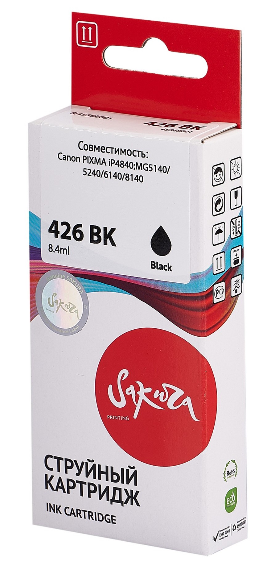 Картридж Sakura 4556B001 (426 BK) – совместимый расходный элемент с чернилами черного цвета, который можно использовать в струйных принтерах и МФУ фирмы Canon. Благодаря идентичной оригинальному картриджу конструкции модель легко устанавливается в каретку печатной техники и обеспечивает ее беспроблемную работу при печати. Одна емкость картриджа Sakura 4556B001 (426 BK) содержит в себе 8.4 мл чернил на водной основе. При печати на любых носителях они не смазываются по поверхности и быстро высыхают.