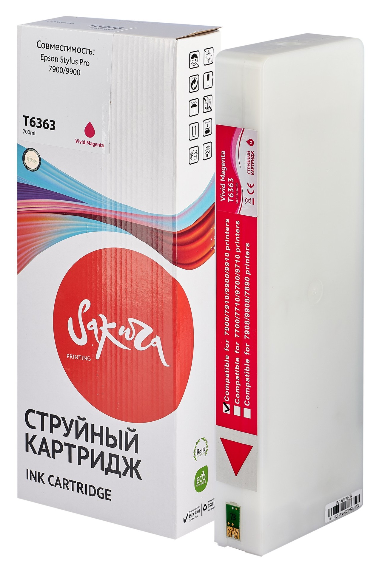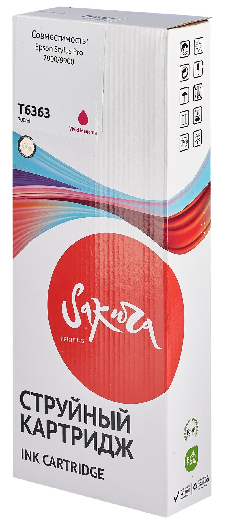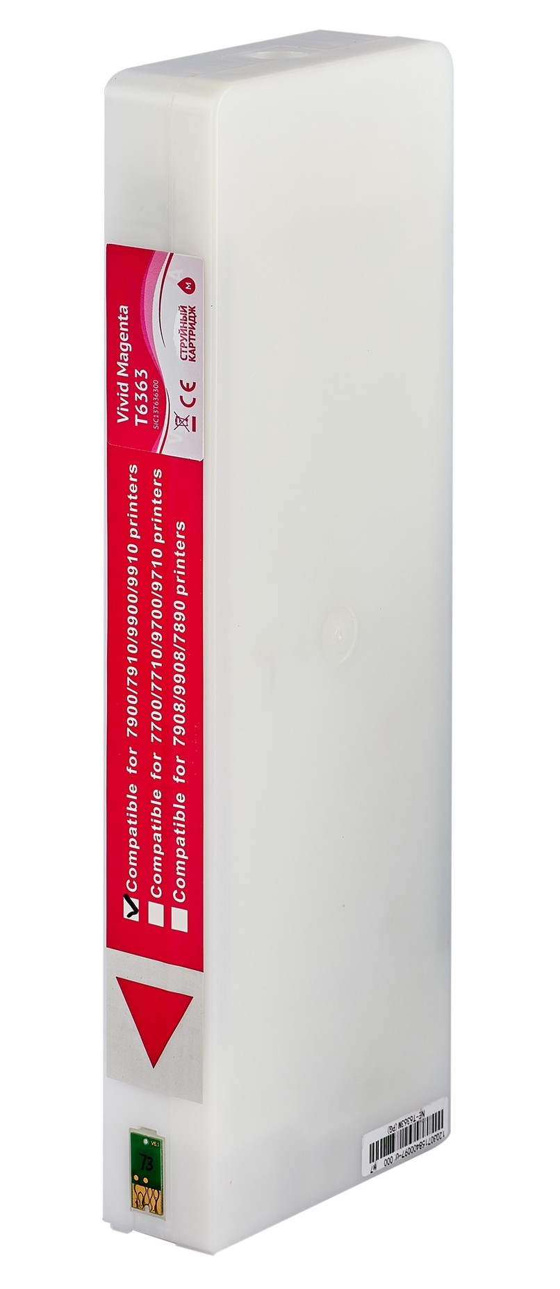 Картридж струйный C13T636300 (T6363 Vivid Magenta) – расходный элемент для струйных принтеров и МФУ фирмы Epson. Модель является совместимой, по своей конструкции она полностью идентична оригинальному картриджу и не уступает ему в качестве печати и стабильности работы печатной техники. Емкость с краской вмещает в себя 700 мл чернил на пигментной основе. В струйном картридже C13T636300 (T6363 Vivid Magenta) содержится краска пурпурного цвета, которая не смазывается, не полосит и быстро высыхает при печати на любых носителях.