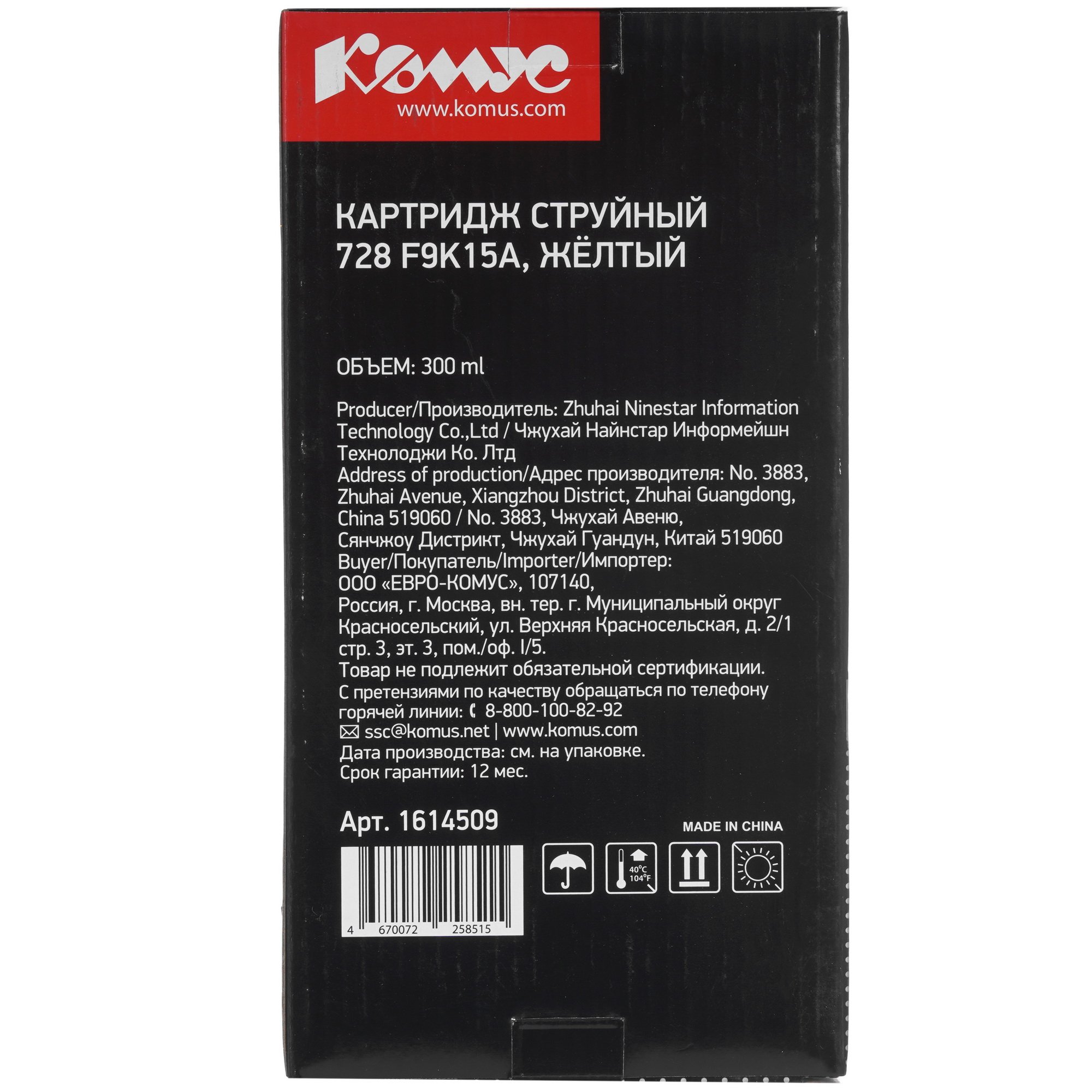 Картридж Комус 728 F9K15A – расходный элемент с чернилами желтого цвета, который можно установить в ряд струйных принтеров и МФУ фирмы HP. По составу модель ни в чем не уступает оригинальному расходнику и обеспечивает такое же качество печати. Чернила моментально впитываются в поверхность листа, не смазываются и не выгорают от солнечных лучей. Благодаря чипу картридж Комус 728 F9K15A сможет передавать печатному устройству информацию о количестве отпечатанных листов. Одна емкость содержит в себе 300 мл чернил для печати.