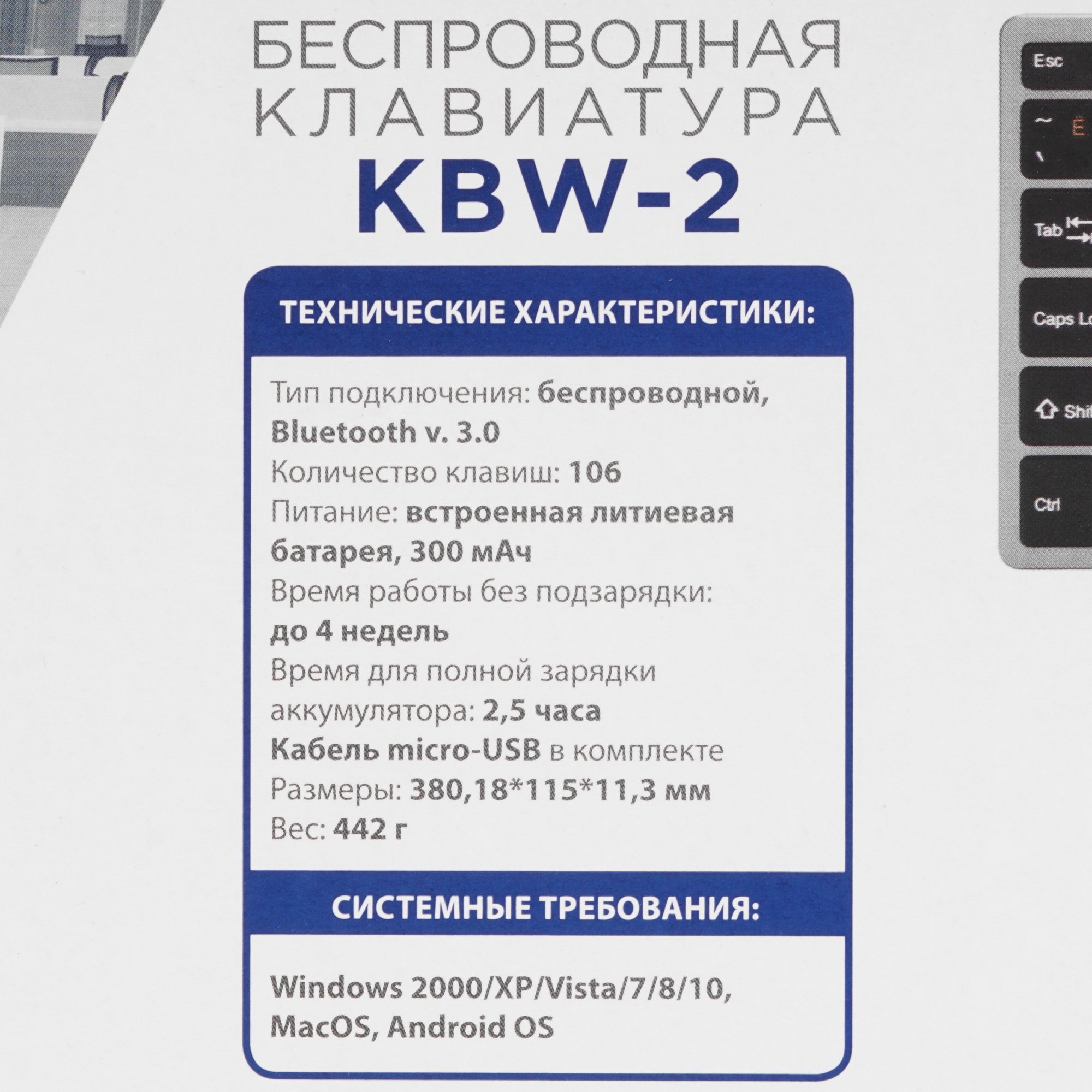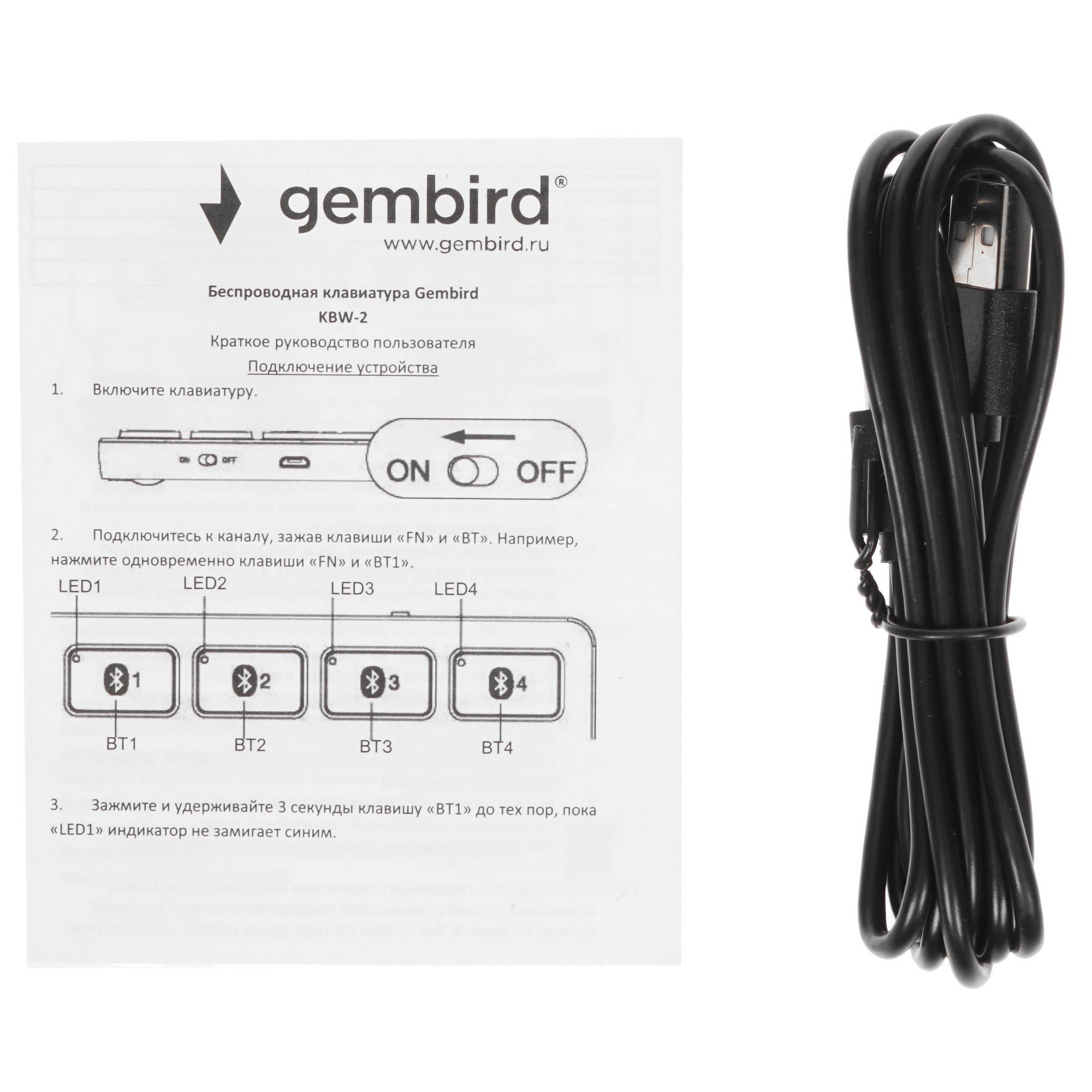 Устройство Gembird KBW-2 дополнено клавишами функции Fn и отдельным цифровым блоком. Островная полноразмерная клавиатура подключается беспроводным способом благодаря наличию собственного аккумулятора и Bluetooth-модуля. Поставка осуществляется вместе с кабелем microUSB для зарядки устройства (требуется 2.5 часа). Полной емкости аккумулятора хватает на 4 недели полноценной эксплуатации.