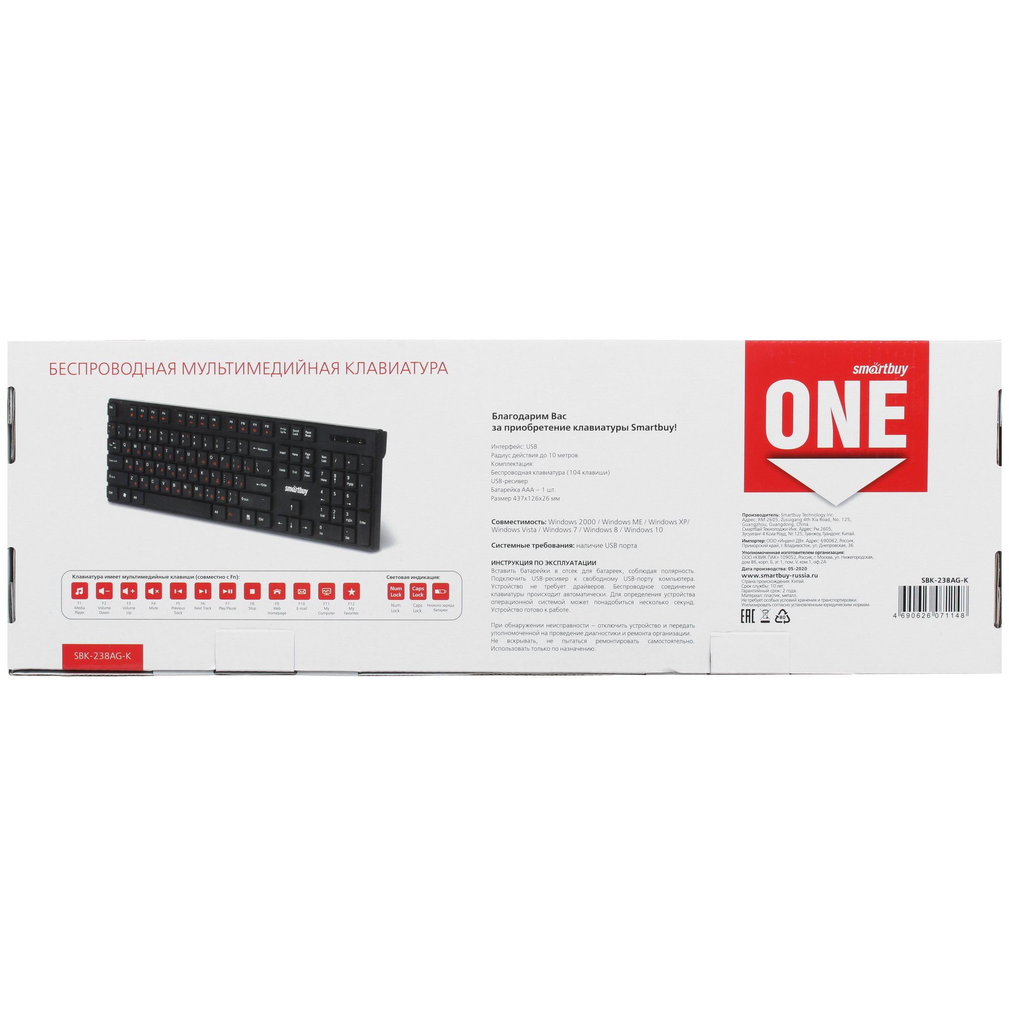 Клавиатура Smartbuy SBK-238AG-K является надежным решением для удобной работы с офисными редакторами, веб-страницами и другими приложениями. Мембранные клавиши обеспечивают четкий и плавный ход с низким уровнем шума. Данная модель оснащена 104 клавишами, включая панель с цифровым блоком. Ресурс службы кнопок 10 млн нажатий подчеркивает надежность. Подключение клавиатуры к ПК осуществляется по беспроводному интерфейсу Wireless (2.4 ГГц) при использовании компактного USB-ресивера. Для автономной работы Smartbuy SBK-238AG-K применяется батарейка ААА.