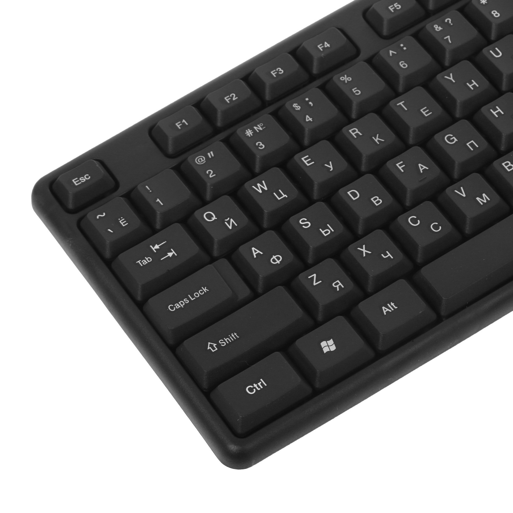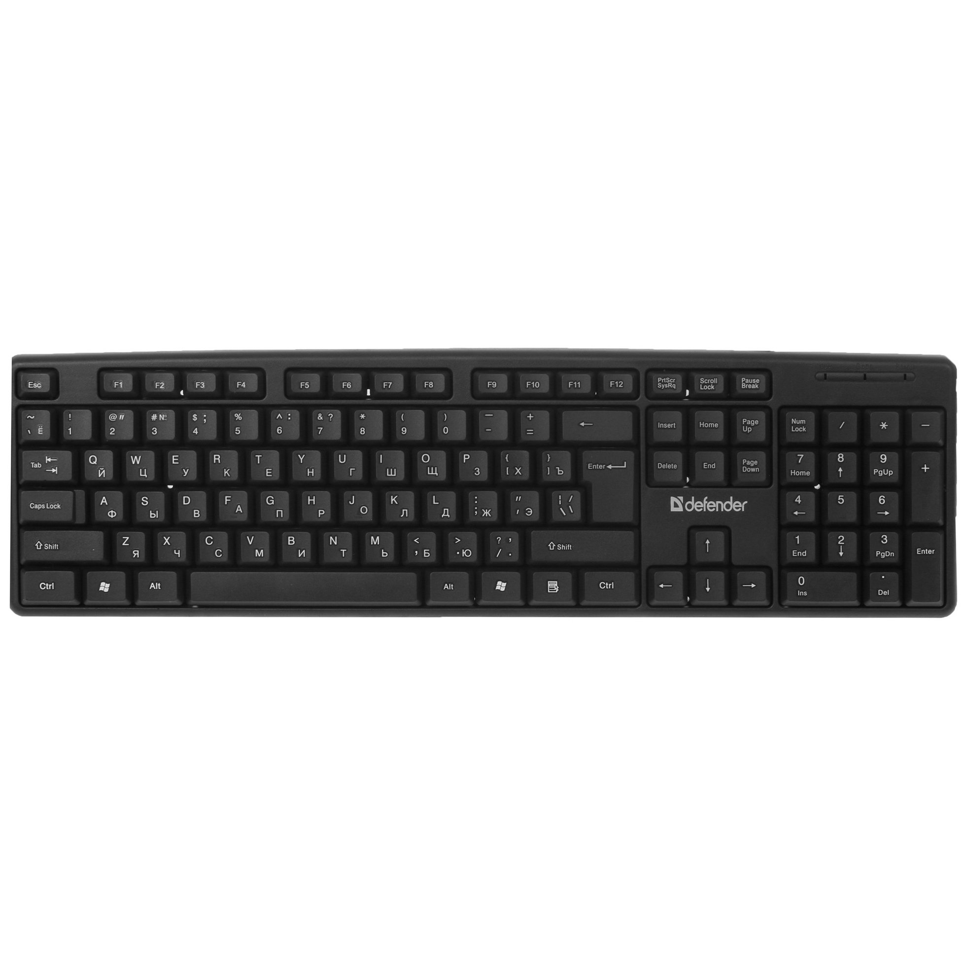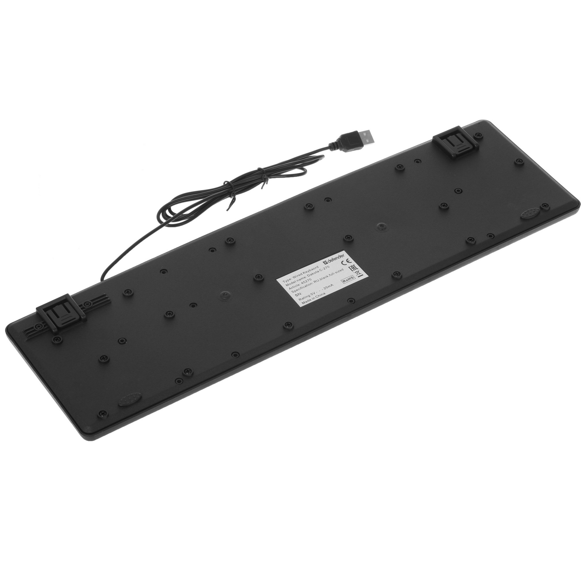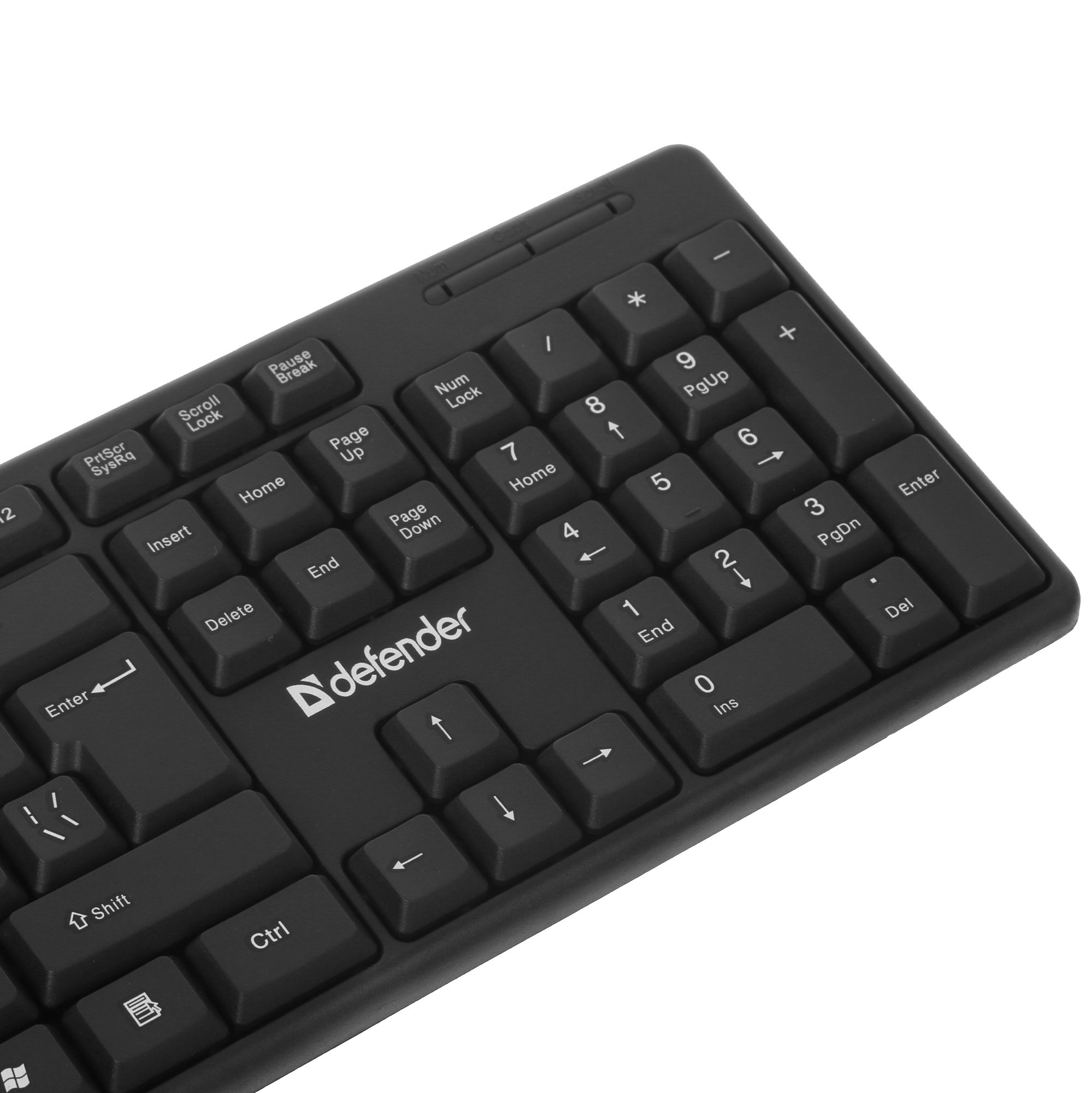 Клавиатура из набора Defender Dakota C-270 оснащается 107 клавишами. Три дополнительные кнопки отвечают за управление питанием. Клавиши мембранного типа, они низкопрофильные, адаптированы для печати. Цифровой блок в конструкции присутствует, он используется для проведения быстрых вычислений.