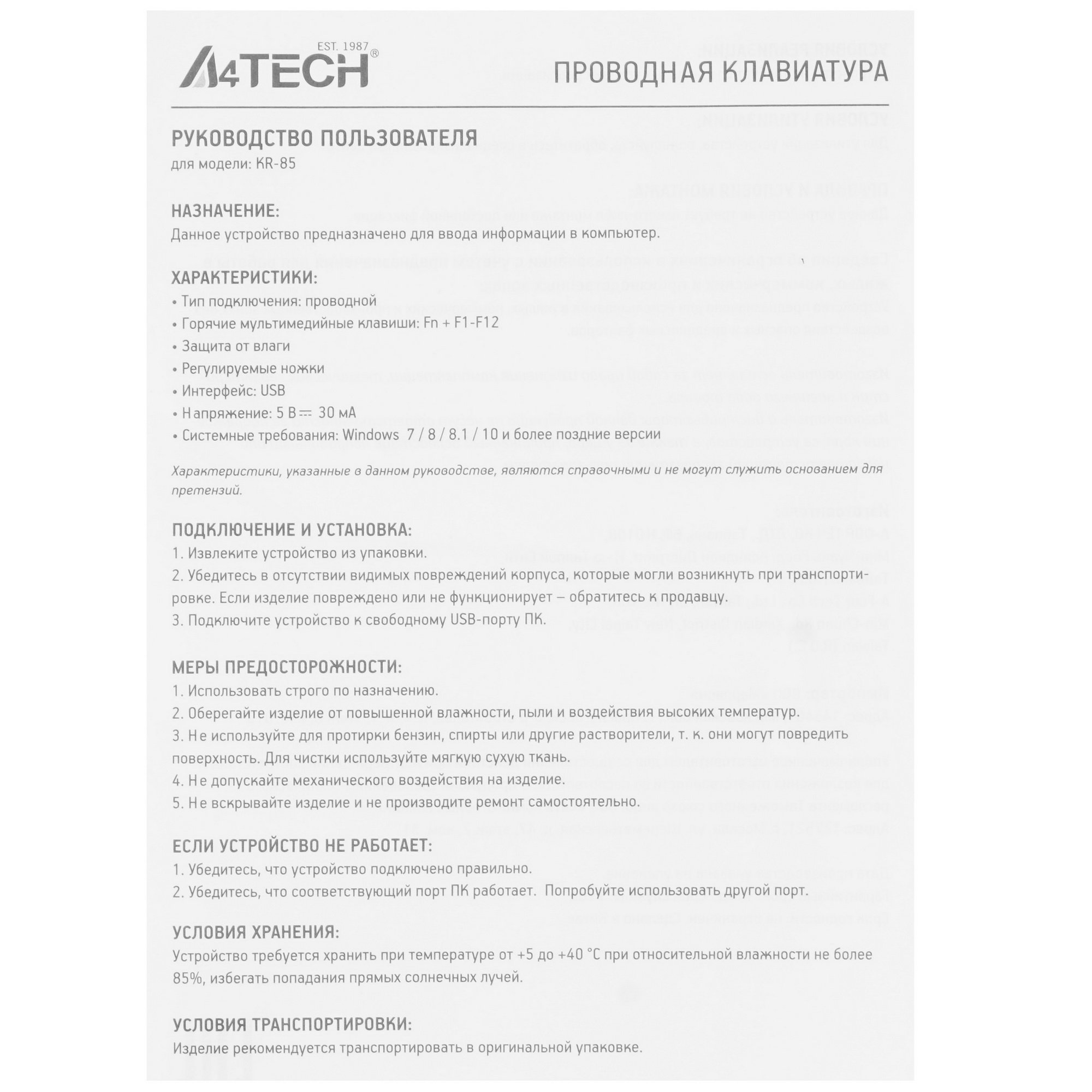 Клавиатура проводная A4Tech KR-85 USB черный