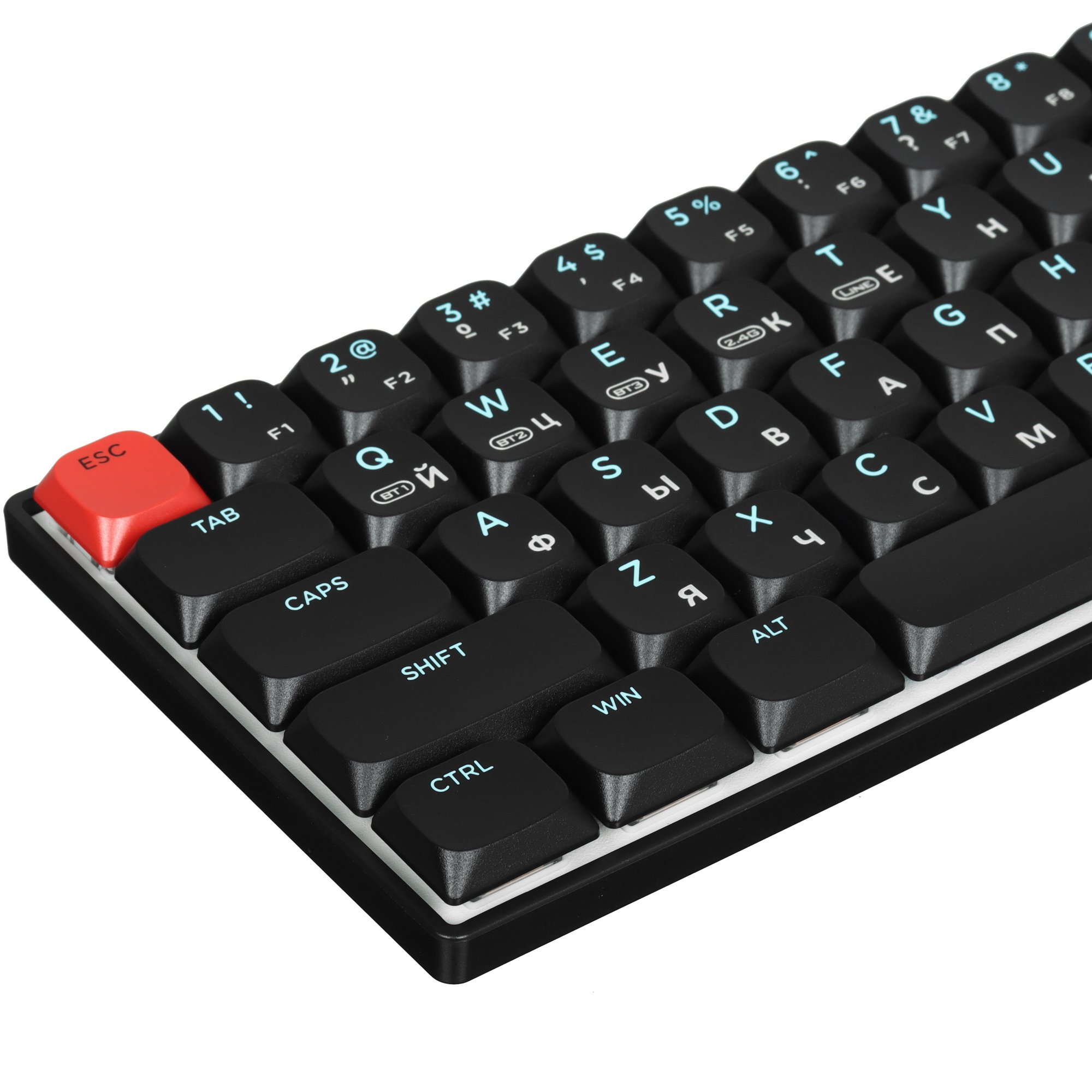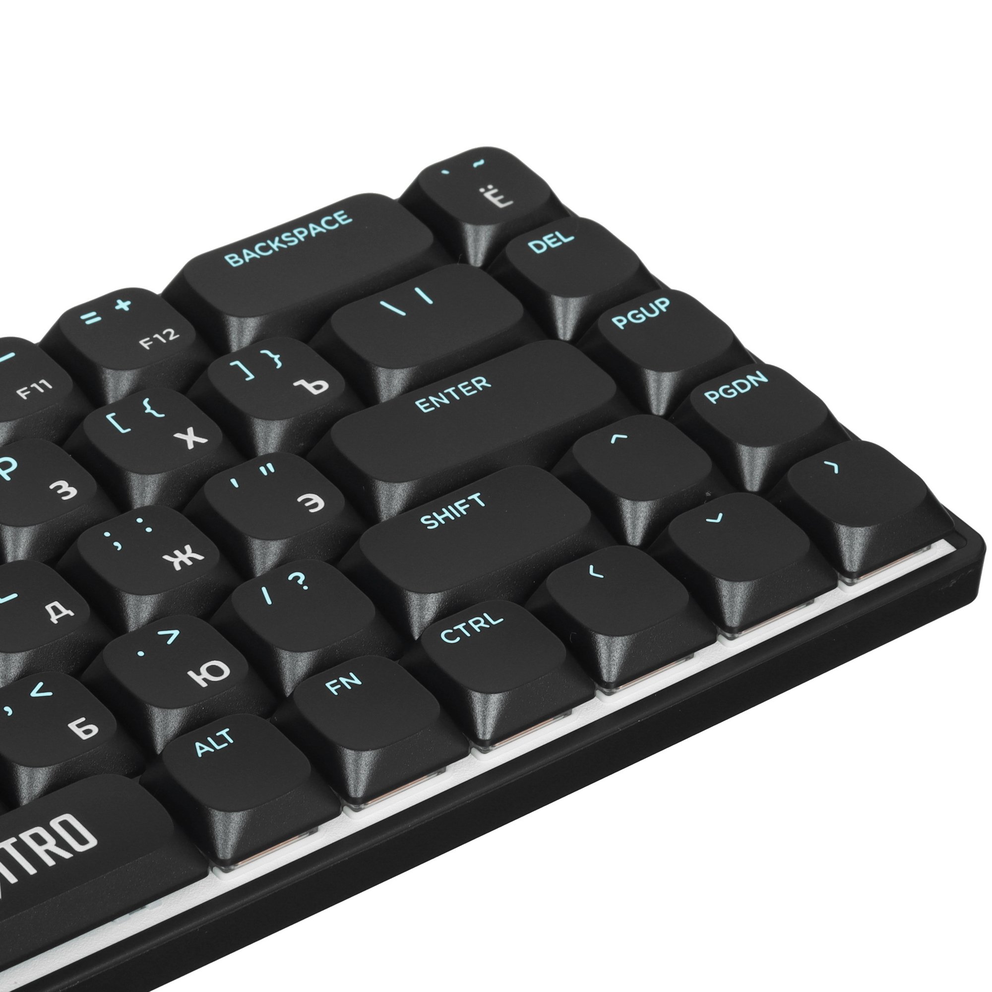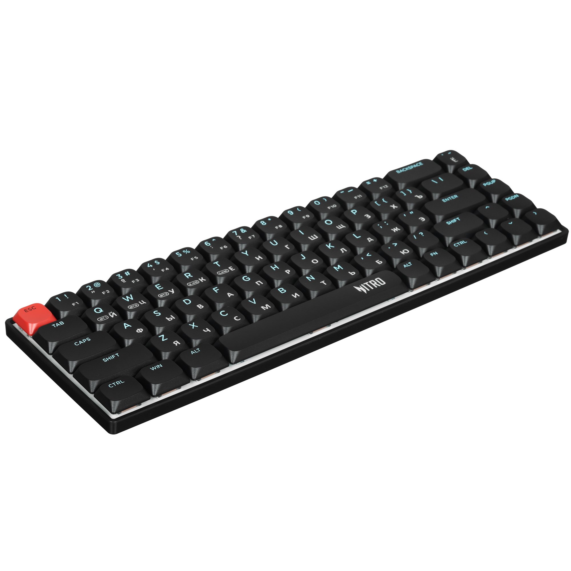 Клавиатура проводная + беспроводная Acer Nitro OKR400 имеет раскладку на 68 клавиш, включая 12 мультимедийных Fn+. Для отзывчивого отклика у нее есть механические линейные переключатели. Технология NKRO 100% предотвращает залипание клавиш во время игры. Ресурс их нажатий рассчитан на 20 млн. Клавиши дополнены синей подсветкой.