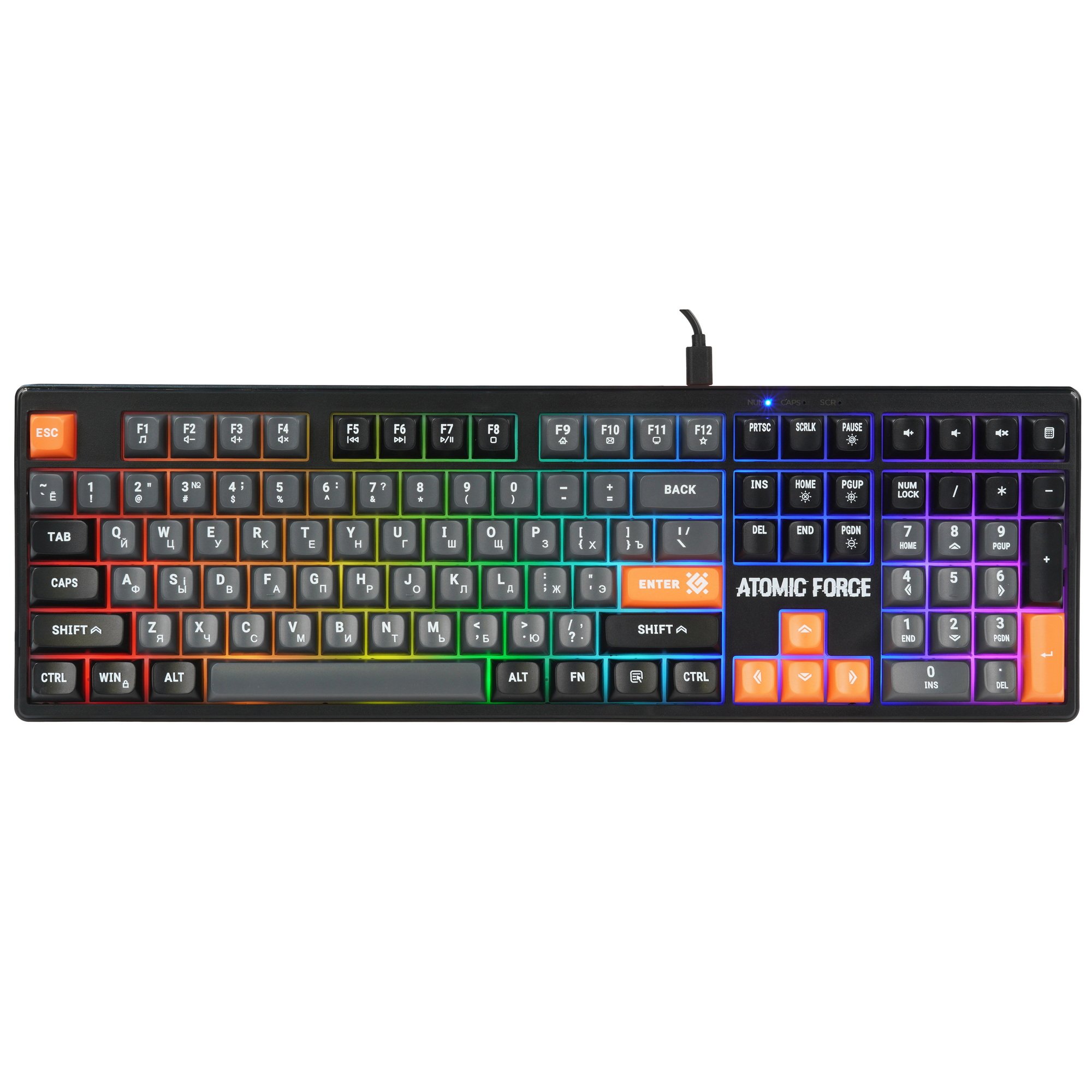Полноразмерная мембранная игровая клавиатура с кейкапами трех цветов и радужной подсветкой. Клавиатура имеет весь необходимый функционал для комфортной игры: возможность блокировки клавиши Win, обмен функциями между клавишами WASD и стрелками, поддержка Anti-ghost для 26 клавиш и управление мультимедиа с помощью клавиши FN.