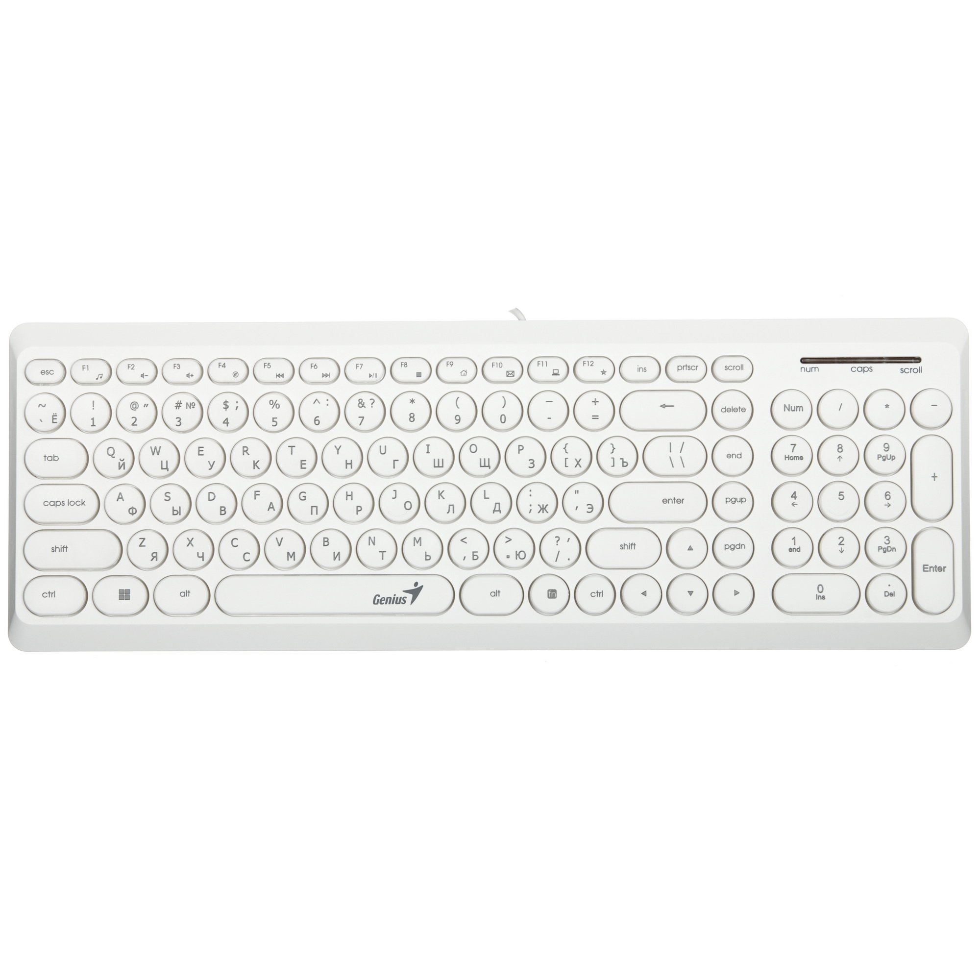 Клавиатура проводная Genius SlimStar Q200 [31310020412] оснащена 101 низкопрофильной клавишей с плавным ходом и быстрым откликом на нажатие. Конструкцией белого пластикового корпуса предусмотрен цифровой блок для ввода числовых данных. Модель относится к мембранному виду. Для срабатывания кнопки необходимо полное нажатие.