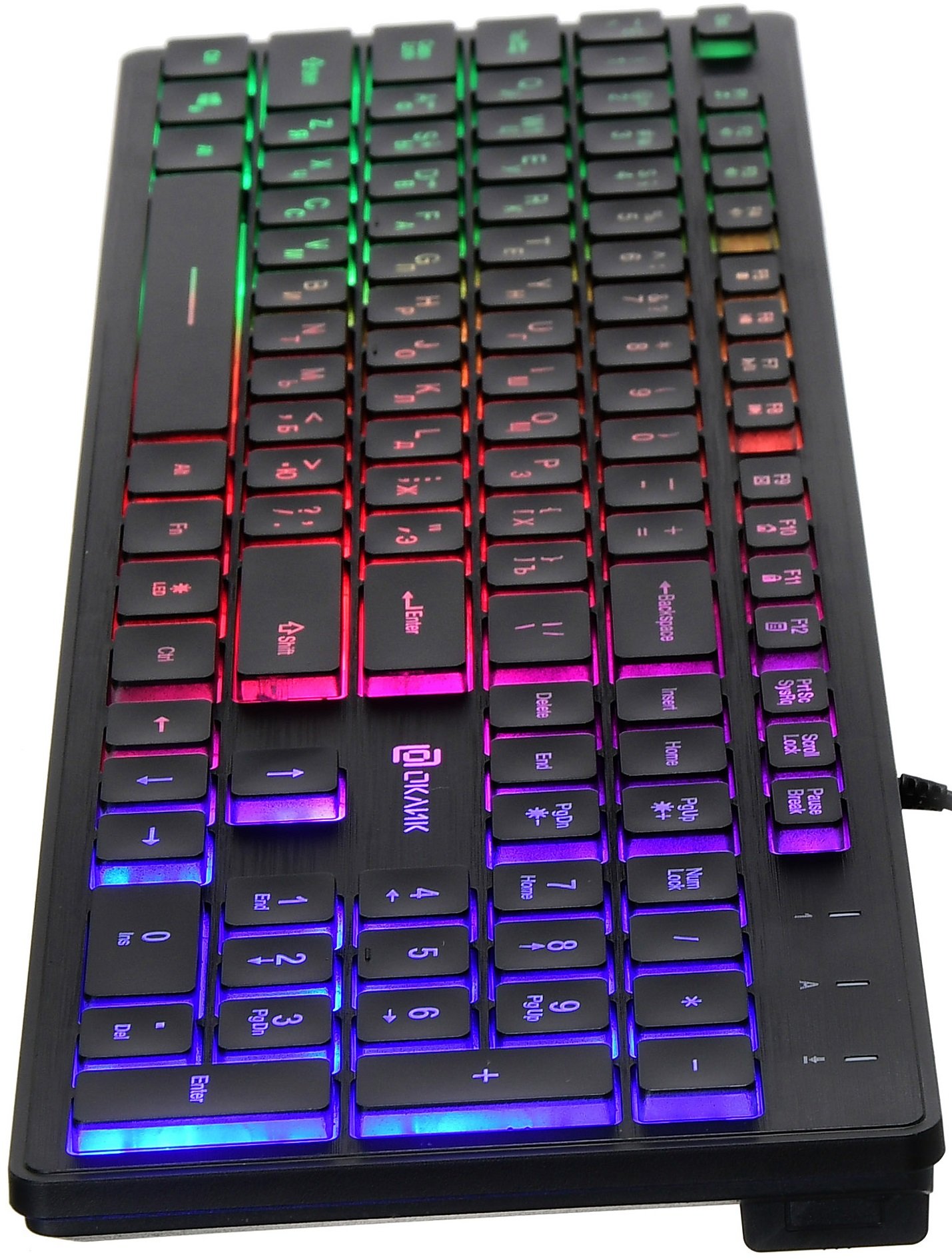 Клавиатура Oklick 550ML обладает незаурядным дизайном: модель имеет стильную RGB-подсветку. Благодаря подсветке использовать клавиатуру можно будет даже в полной темноте. Не будет являться помехой и отсутствие владения методом слепой печати.