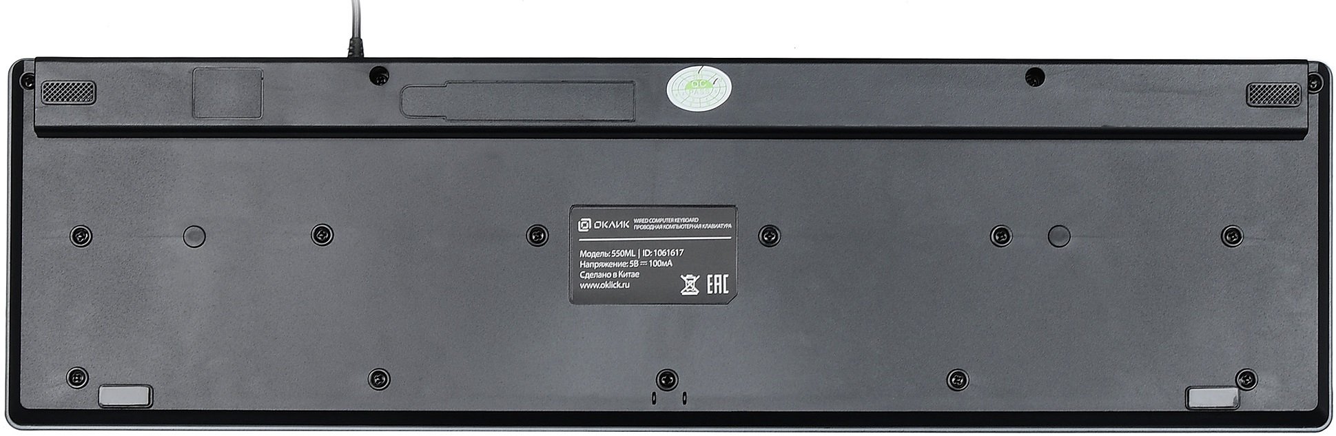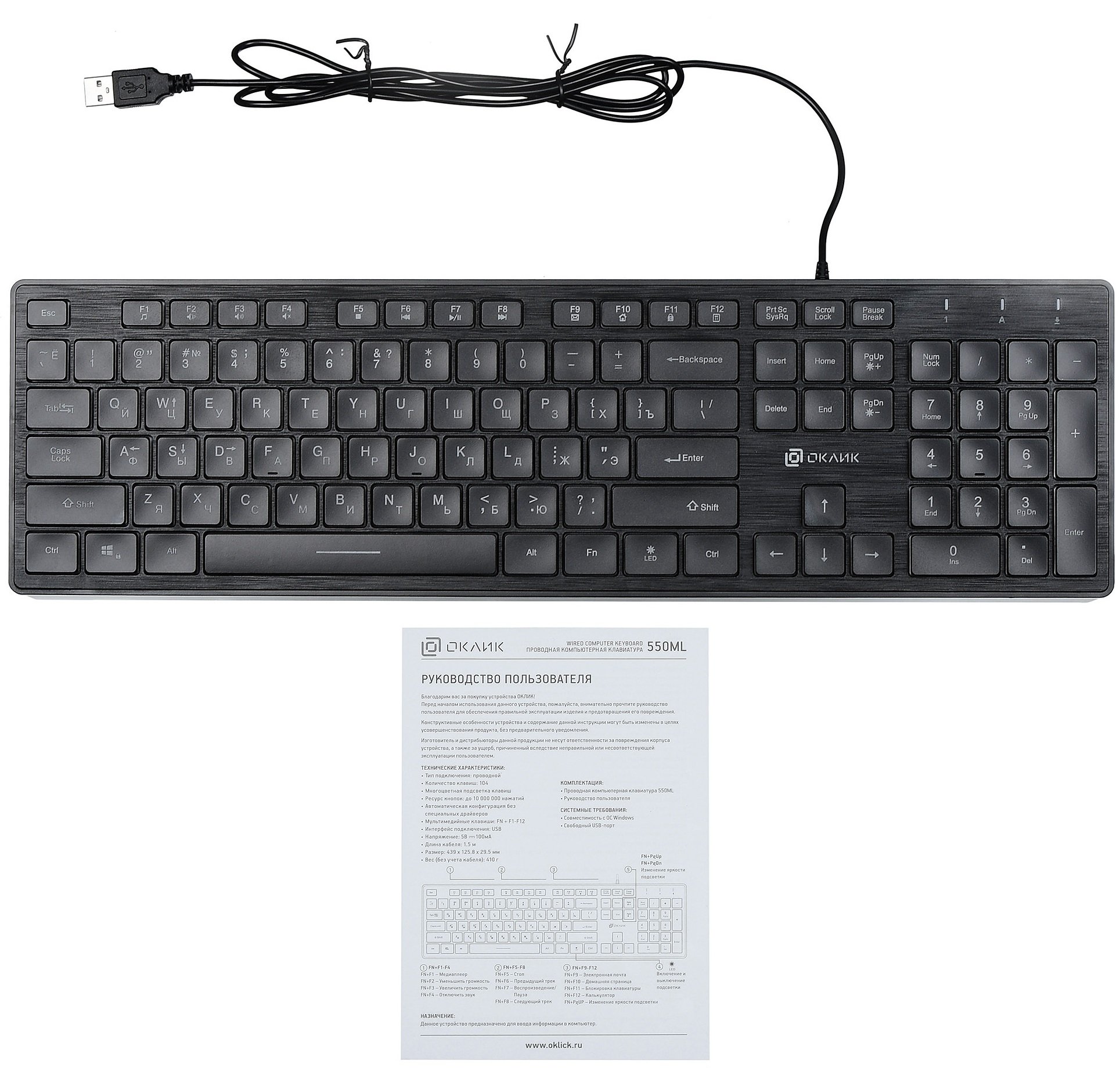 Для подключения клавиатуры Oklick 550ML используется интерфейс USB. Модель совместима как со стационарными, так и с мобильными компьютерами. Длина интерфейсного кабеля равна 1.5 м. Ширина, высота и глубина корпуса клавиатуры равны 439, 29.5 и 125.8 мм соответственно. Масса клавиатуры, равная 410 г, не создаст сложностей при ее транспортировке.