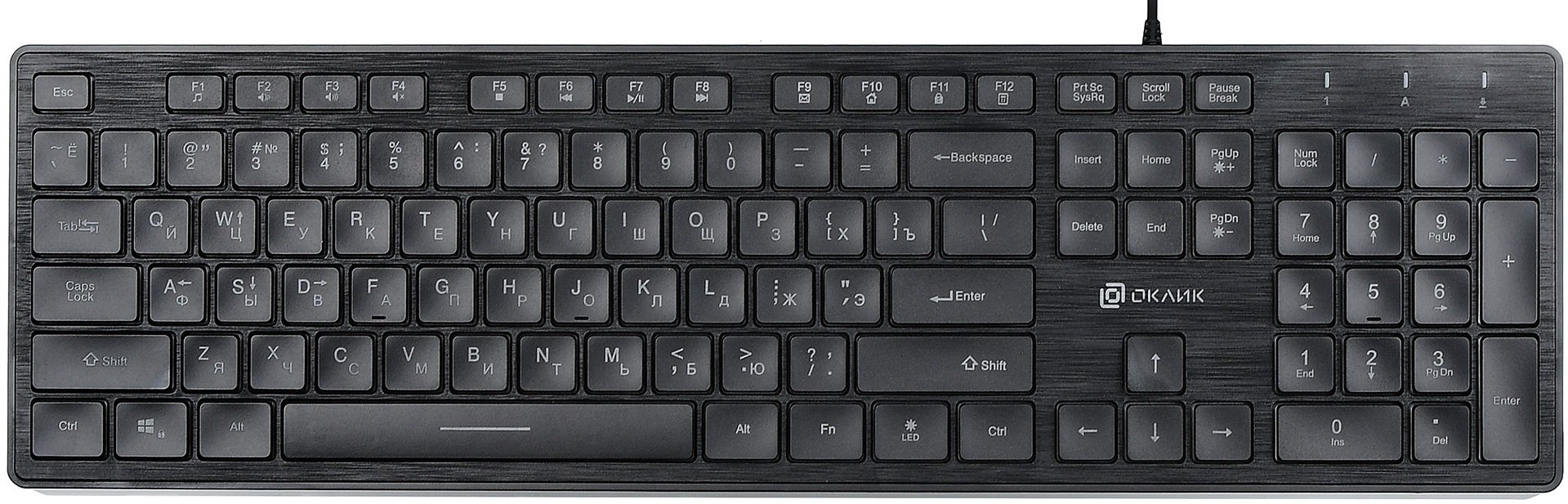 Клавиатура Oklick 550ML, соответствующая мембранному типу, представляет из себя универсальное устройство ввода, которое подойдет для эксплуатации как дома, так и в офисе. Особенностью конструкции модели является низкопрофильное исполнение клавиш, которое придется по душе пользователям, привыкшим к использованию ноутбуков. Всего клавиш – 104. Использована традиционная компоновка кнопок. В наличии цифровой блок, который будет полезен при проведении расчетов или заполнении электронных таблиц.