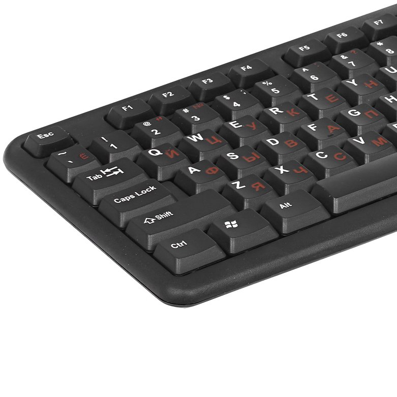 Клавиатура Oklick 90M является мембранной, что обеспечивает тихую работу и плавное нажатие каждой клавиши. Все цифровые и буквенные значения нанесены на клавиши устойчивой к истиранию краской. Буквы русского алфавита выполнены в красном цвете. Клавиатура имеет удобное подключение через USB-интерфейс. Для этого у клавиатуры есть гибкий провод длиной 1.35 м, с соответствующим коннектором. Матовая пластиковая поверхность клавиатуры очень проста в уходе, на ней практически не остаются следы от пальцев и ее легко протирать салфеткой.