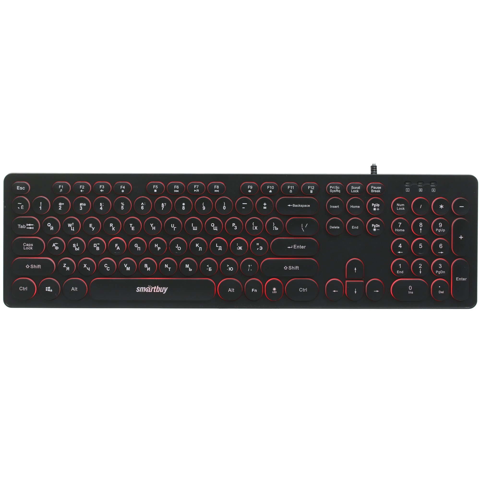 В полноразмерной клавиатуре SmartBuy SBK-328U-K реализована подсветка с поддержкой 3 цветов и 3 регулируемых уровней яркости. Устройство выполнено в прочном пластиковом корпусе черного цвета. Подключение клавиатуры к ПК осуществляется посредством кабеля USB.
