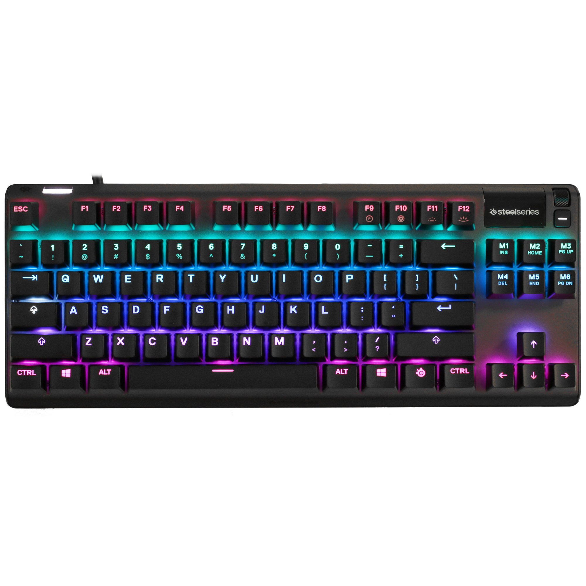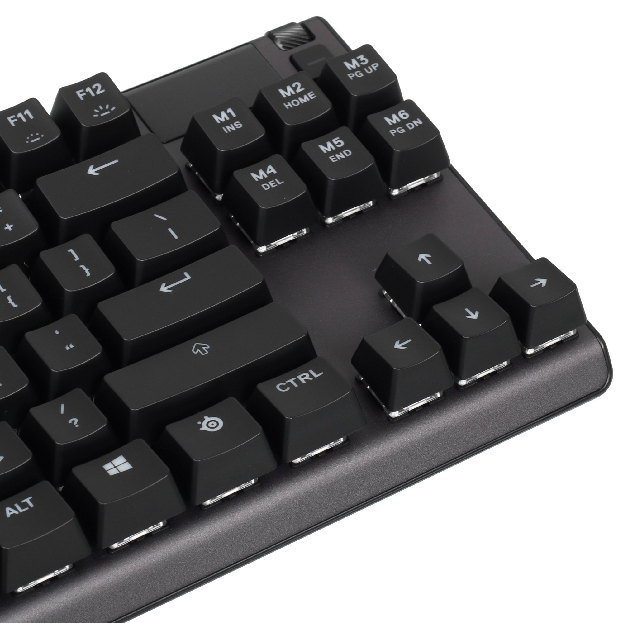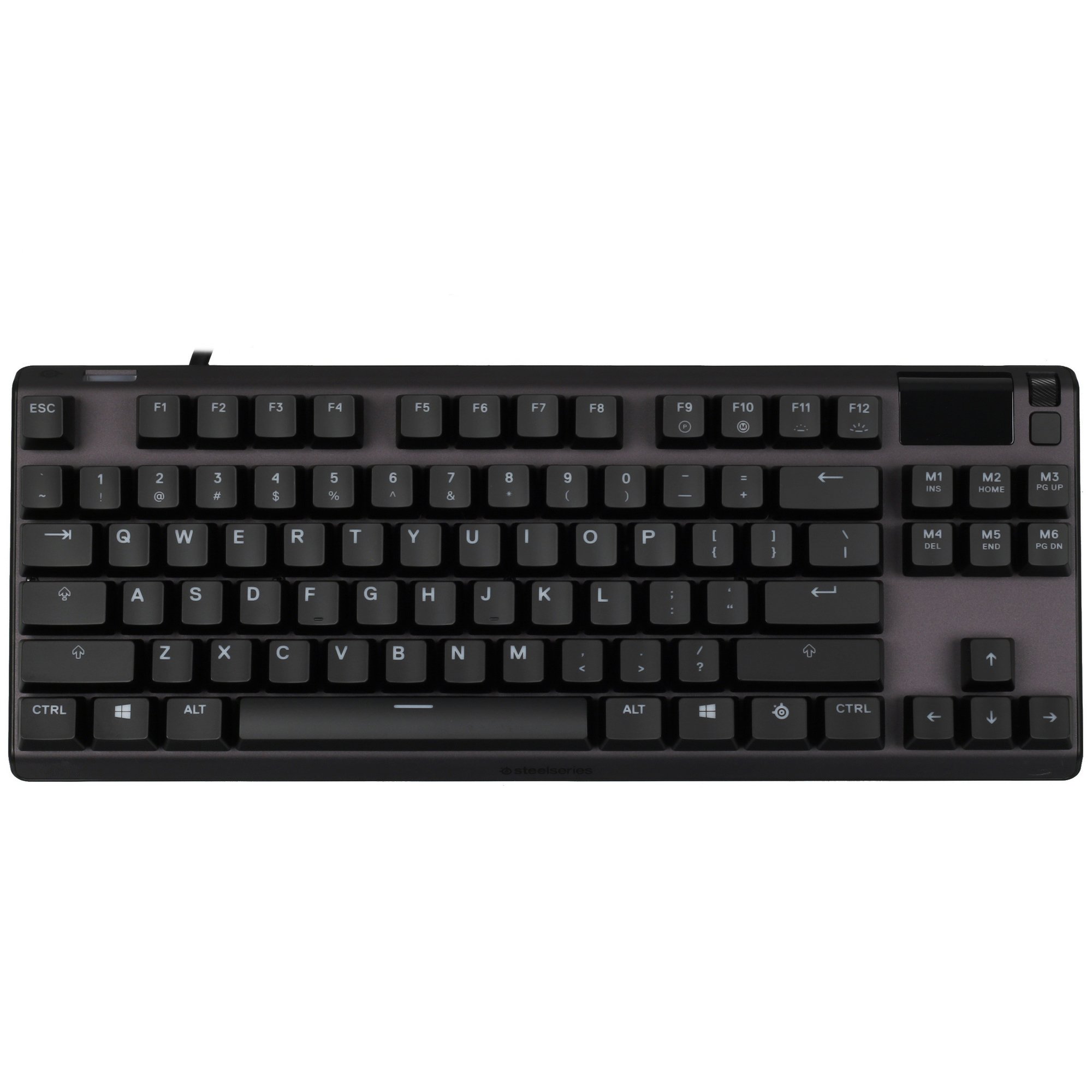 Клавиатура проводная SteelSeries Apex 7 TKL – игровая модель с дизайном скелетон и магнитной подставкой под запястье. RGB-подсветка позволяет работать за компьютером в любое время суток и выполняет функцию декора. Модель дополнена небольшим дисплеем и колесом прокрутки для быстрой настройки громкости, перемещения между открытыми вкладками и т. д.
