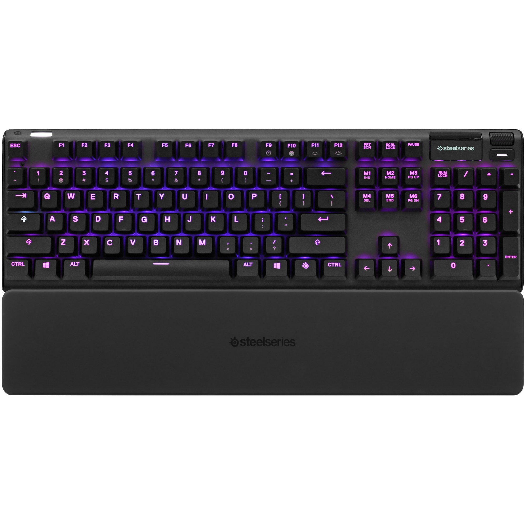 Клавиатура SteelSeries Apex 7 [64636] выполнена в прочном металлическом корпусе. Подсветка RGB гарантирует удобное управление в темное время суток. Подставка под запястья снижает нагрузку на руки и повышает комфорт продолжительных игровых сеансов. Для подключения клавиатуры к ПК используется кабель с интерфейсом USB.