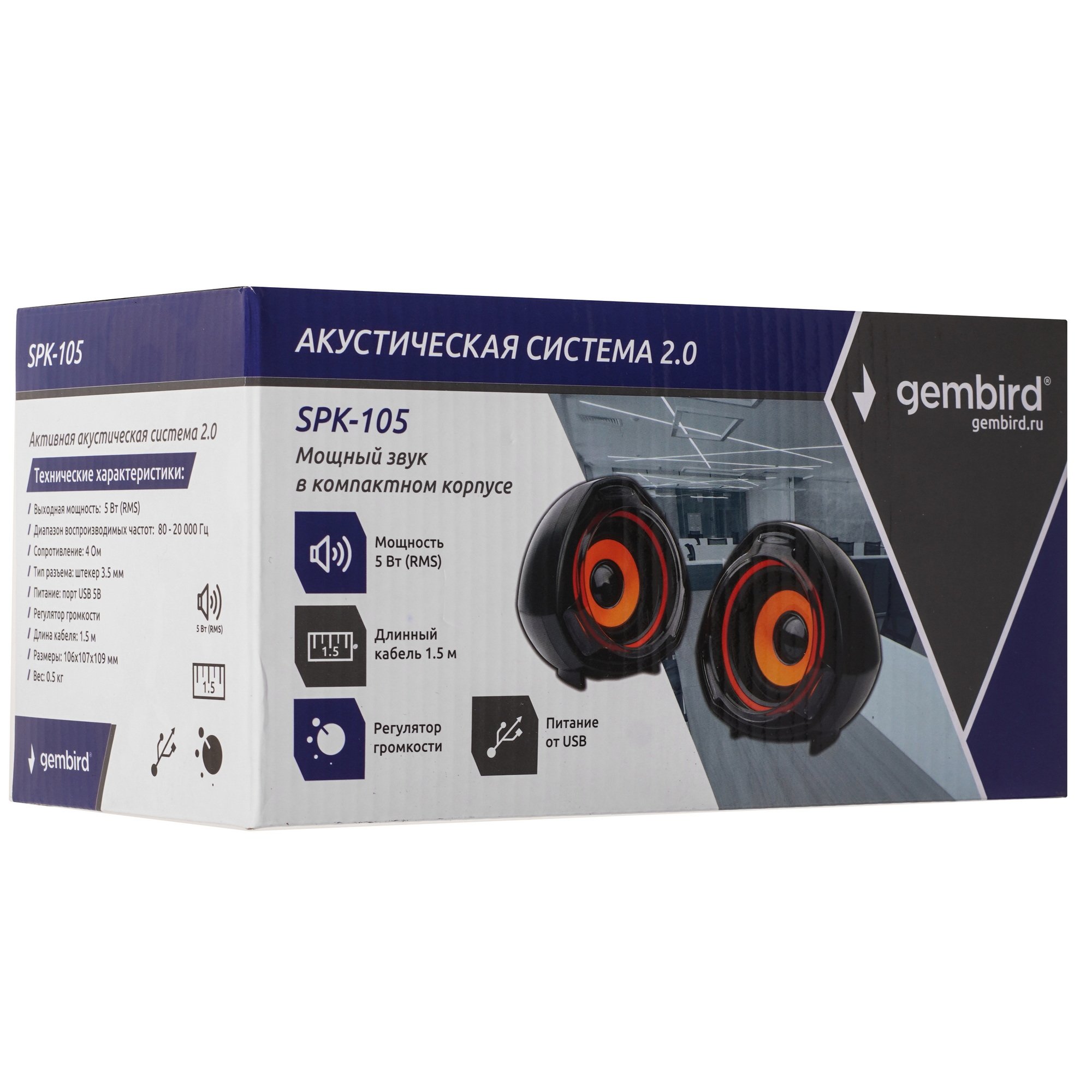 Колонки Gembird SPK-105 подключаются к ПК, ноутбуку, смартфону, планшету через разъем jack 3.5 мм. Конструкцией черного пластикового корпуса предусмотрено 2 стереодинамика мощностью 5 Вт для воспроизведения чистого звука без искажений и эха.