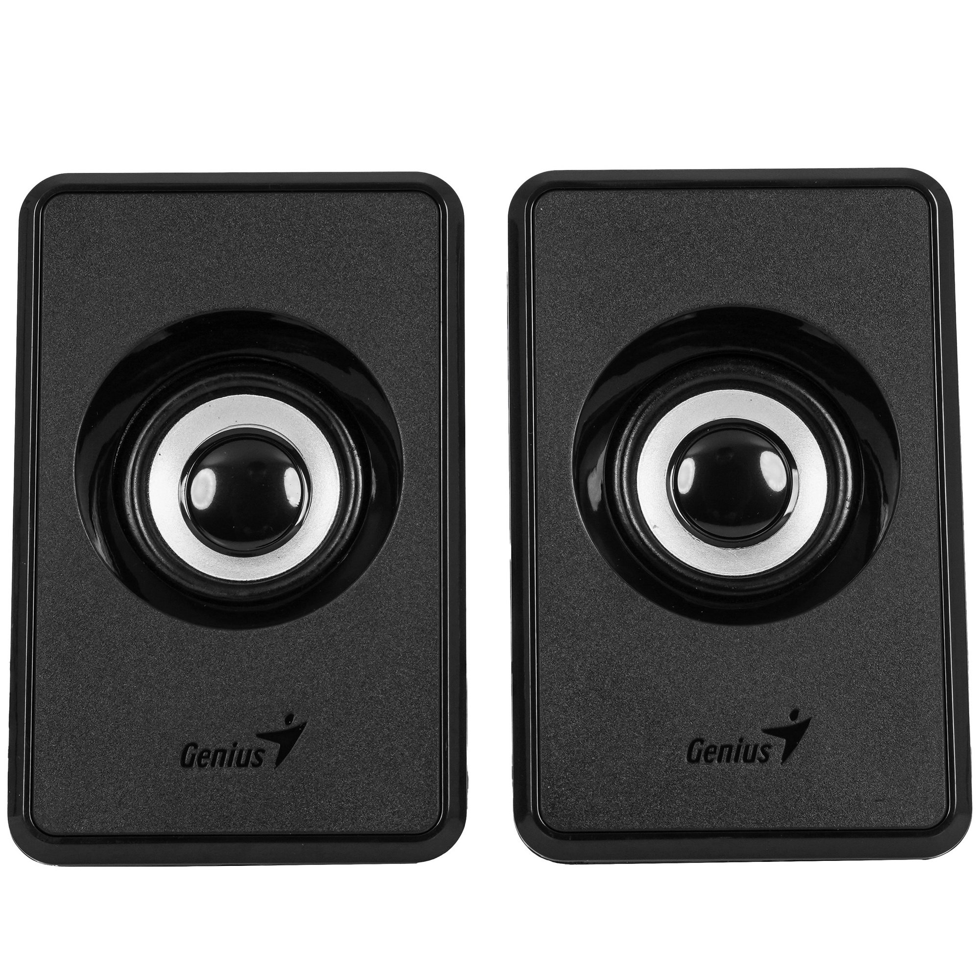 Колонки Genius SP-125U подключаются к необходимому устройству через выход 3.5 Jack. Конструкцией пластикового корпуса предусмотрено 2 стереодинамика мощностью 3 Вт. Регулятор громкости находится на боковой панели.